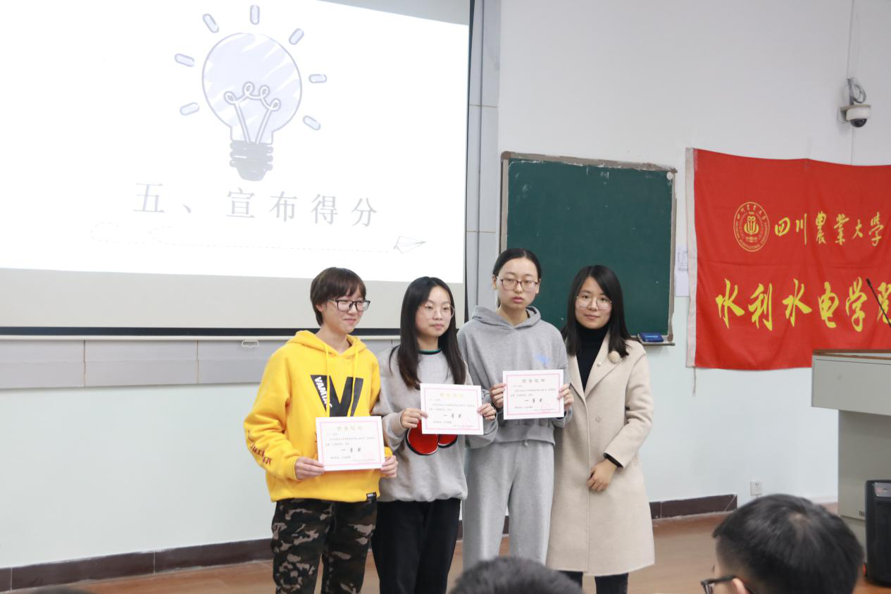 在互动环节期间,由工作人员统计参赛队伍的得分情况,最终第三组“答的队”摘得桂冠,并获得了代表学院参加第七届“李冰杯”的参赛资格。最后由罗惠中老师和主席团成员为获奖队伍颁奖留念。