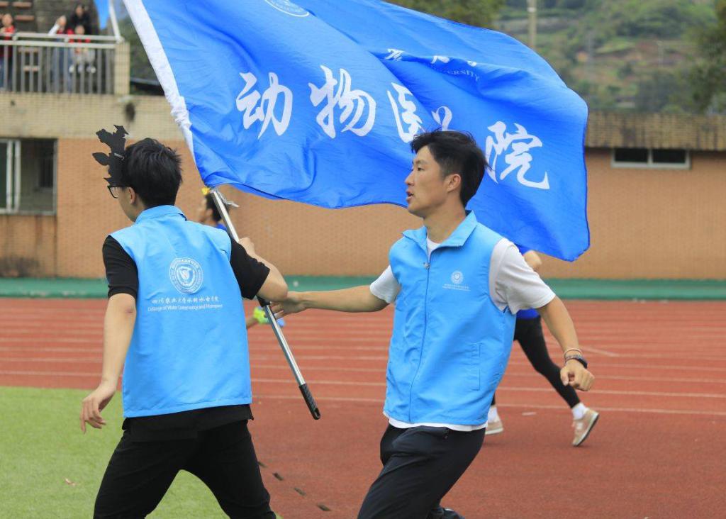友谊第一,比赛第二。在运动会上,我院啦啦队和后勤人员不仅为本院的运动员加油助威,也给予动医同学以支持和鼓励。不仅如此,水院的陪跑团同学还主动加入动医陪跑团传递院旗、积极助力陪跑。