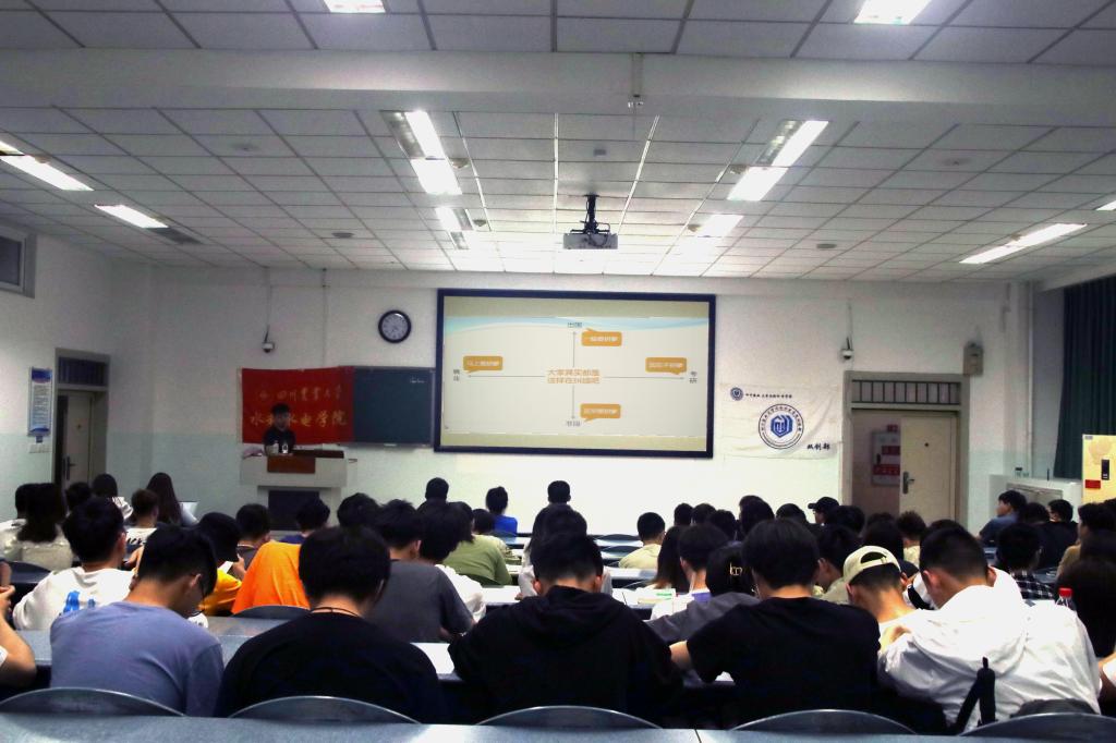 讲座伊始,赵江涛为同学们列出了川内水利水电工程专业开设的院校与毕业人数,让大家直观感受到本专业与其他热门专业相比考研的竞争压力。在分享自己考研的经验以及身边同学、亲人的就业经历后,赵老师直接点明了选择考研还是就业这一焦点问题。随后,赵老师以一位研究生毕业后由于经验不足,反而就业不如本科生好的往届学生为例,将考研与就业两个方向的优劣一一列出,并希望同学们可以多维度思考、权衡二者的利弊。期间,赵老师还建议同学们在本科在读期间,可以尽量多考取如二级建造师、二级注册建筑师等含金量高的证书。“好的目标不是自己伸手就能够着的,也不是怎么努力都够不着的,而是要跳起来才能够着的。”讲座的最后,赵老师勉励同学们一定要树立与职业相契合的短期、长期目标,向着自己的目标努力奋斗,获得了同学们持久热烈的掌声。