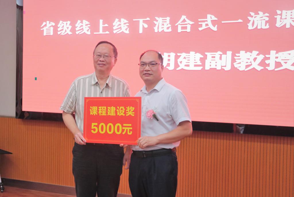 学校党委副书记张强教授为省级线上线下混合式一流课程团队负责人胡建副教授颁奖