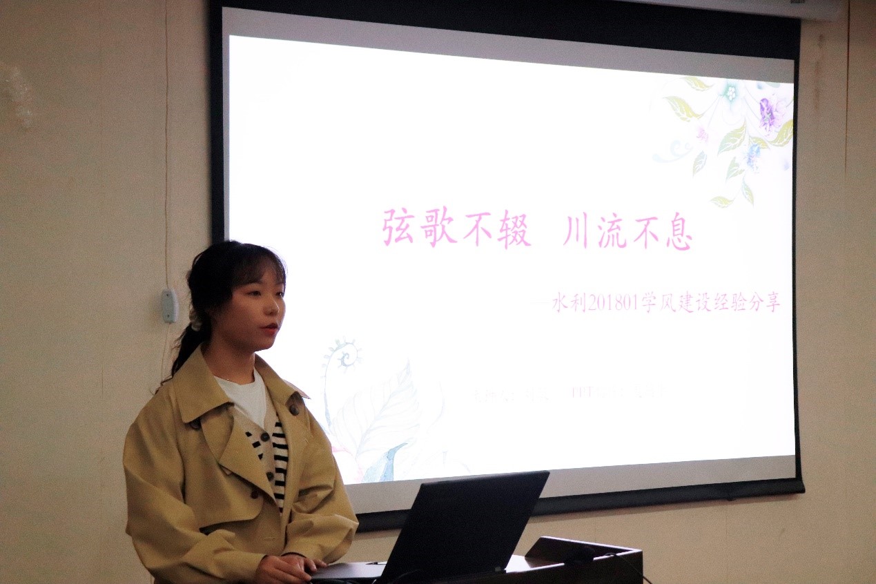 详尽的方案坚定了与会成员共建优良学风的信心与决心,紧随其后的优秀小班代表分享则提供了小班学风建设的宝贵经验。水利201801班代表,曾荣获“十佳团支部书记”荣誉的刘敏同学向大家分享了班级建设的“五件法宝”。她强调,“在班级中不要做旁观者,而要成为班级的建设者、组织者、领导者。在建设学风过程中,成就更好的班级,也成为更好的自己!”
