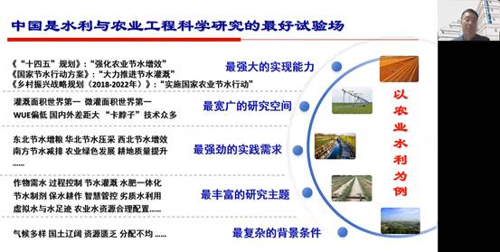 李云开教授以农业水利为例,从《“十四五”规划》、《国家节水行动方案》、《乡村振兴战略规范2018-2022》等强化农业节水增效、大力推进节水灌溉、实施国家农业节水行动、WUE偏低、国内外差距大、“卡脖子”技术多等多方面阐述了中国是水利与农业工程科学研究的最好试验场。其次,结合2021年习近平总书记出席中国科学院第二十次院士大会、中国工程院第十五次院士大会和中国科协第十次全国代表大会重要讲话,以及习近平同志在中国共产党第二十次全国代表大会上的报告,阐述了青年高水平创新2138cc太阳集团官网入口与发展的国家需求。