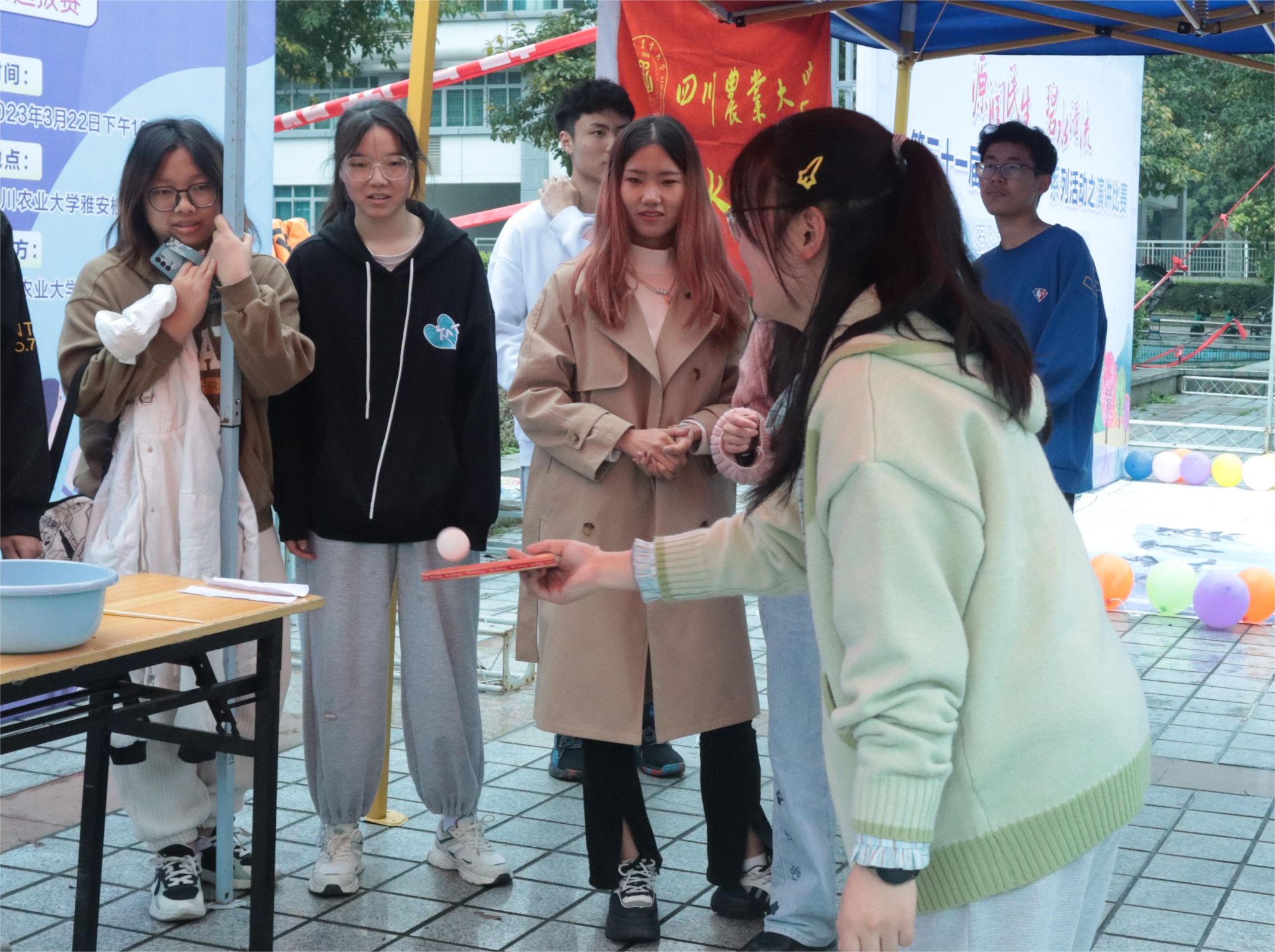 “逐趣之水”世界水日游园会以游戏的形式科普水知识、水文化,紧扣“惜水护水”的主题,共设“乒乓一条龙”、“蒙眼摸水”、“手脚并用”、“蜻蜓点水”及“护水大作战”等五个项目。其中“护水大作战”成为同学们最青睐的游戏,参与者需两两一组,两人分别吹起装有水的气球,使气球卡住纸杯内侧避免纸杯掉落,并背对背夹住一个气球运往终点。在游戏“蒙眼摸水”和“蜻蜓点水”中,参与者均需回答与水有关的问题来获得更多游戏机会,同学们为此都卯足了劲,现场也热火朝天。