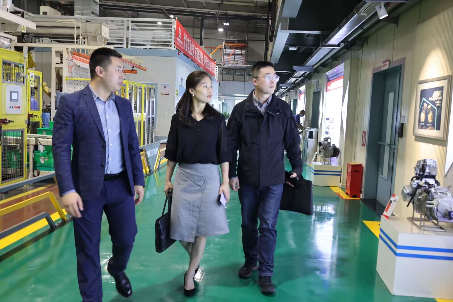 在交流座谈会前,侯莉、黄锎靓一行在工作人员带领下参观企业展厅、了解企业文化、到访生产一线,详细了解和感受工作环境和工作状况。