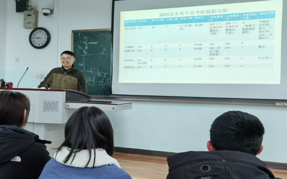 注重教师翼支撑。新生教育时,支部教师向学生介绍水电专业学生考研情况,包括录取院校、报考专业等。鼓励学生参与学校五大计划项目,帮助学生提前做好考研规划,确立目标。每年四月,支部组织召开面对大三年级的考研动员会议,介绍毕业年级考研情况,让学生了解各大高校报考难度,掌握不同高校硕士招生特点,避免集中报考。指导学生从自身实际出发,结合近年报录情况,合理选择报考院校和报考类别。