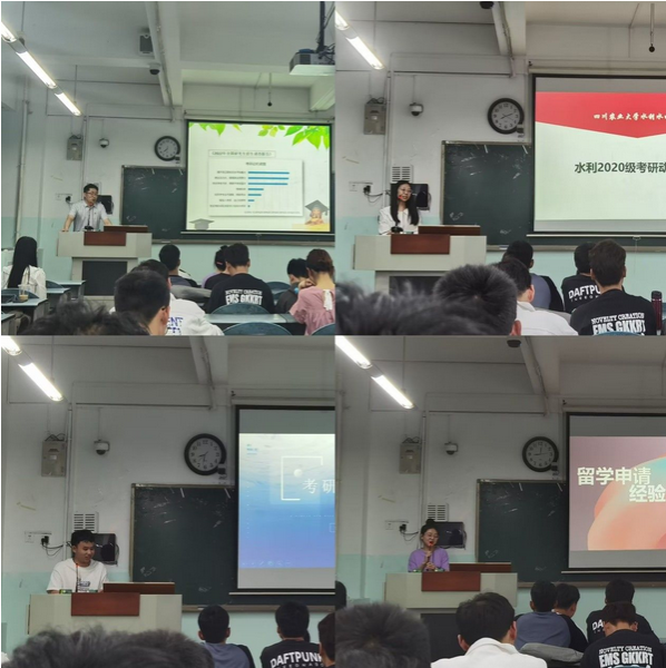 漆力健分析了当前考研形势、考研的动机与目的以及提升学历的重要性,并用多组数据展示了水利水电工程专业近年考研升学情况,在报考院校及专业选择方面,介绍了专业相关的一些考研院校的情况,供大家借鉴和参考。鼓励同学们只要坚定信念,坚持到底,必定苦尽甘来。2019级林京都、熊涛、王文杰等3位优秀的学长针对考研复习的全程规划、参考书选择的建议以及报考的注意事项等多方面进行了精彩的分享,并送上温暖的祝福和鼓励。