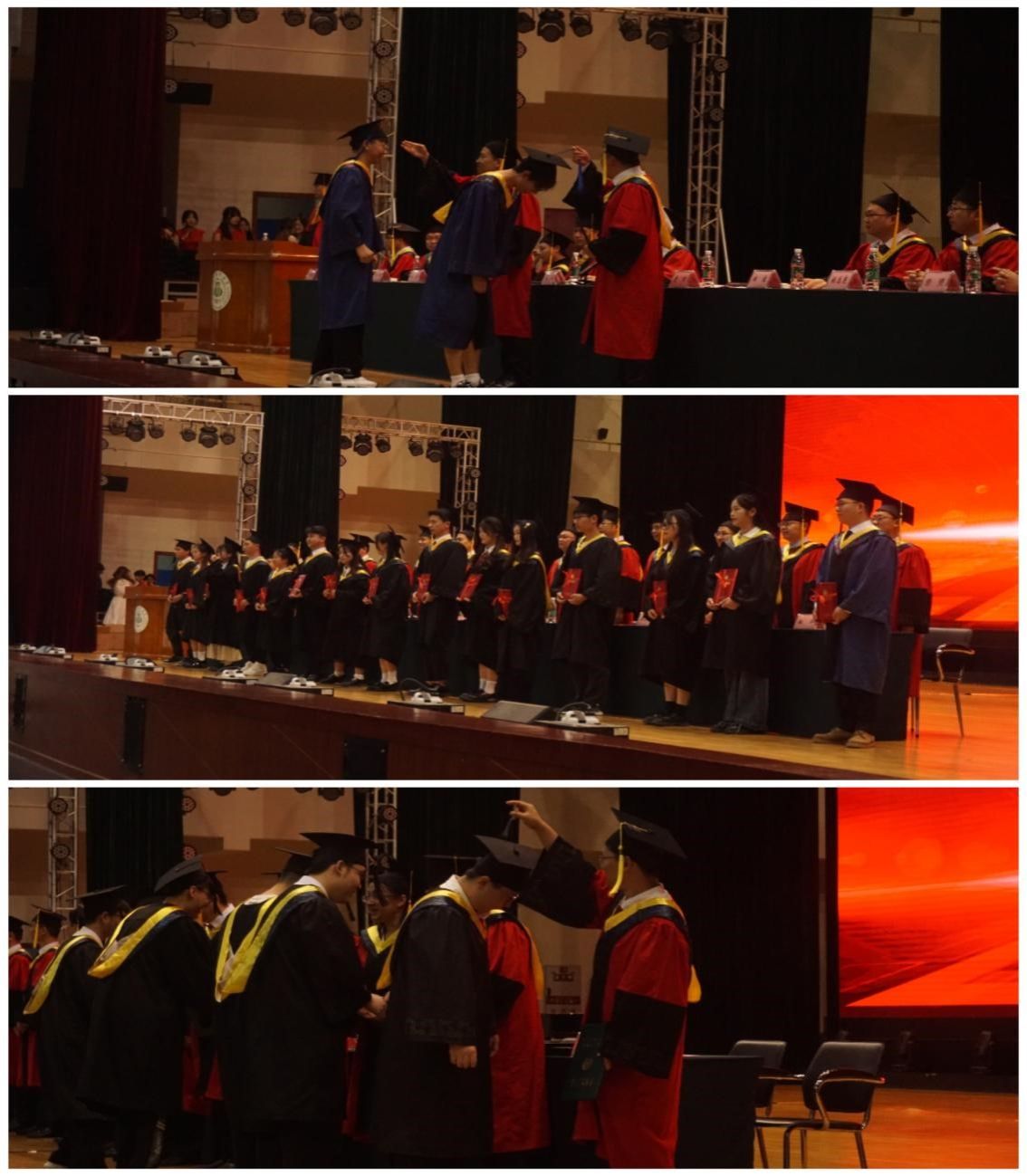 典礼上,学院院长曹迎为毕业学子送上真挚的寄语与殷切的希望。他由衷祝愿全体毕业生能够与时代共进,为家国奉献,不断磨炼自我品格,提升自我素养,实现自我价值。随后,隆重的优秀毕业生、优秀毕业论文颁奖仪式和学位授位仪式伴随激昂辉煌的音乐进行,敲动着每位毕业学子们内心激动的心弦。学院教师代表、毕业生代表依次上台发表感言,吐露在场师生共同的心声,分别带来令人感动的期冀与怀念。当这场庄严的典礼在《歌唱祖国》的合唱中圆满落幕时,梦想新征程的嘹亮号角也就此吹响。