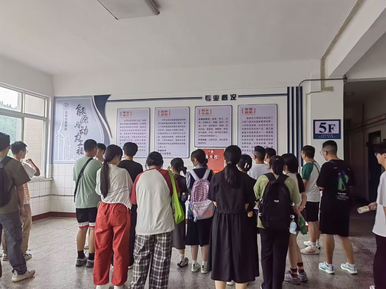 步入工学楼,墙面上展示着水利水电学院的发展史、学院简介、师资力量及优秀成果。在班助的讲解下同学们详细了解了水利水电学院的院训、成就、历史等,新生小水滴们在文化墙前驻足观看,时而低声交流,时而陷入沉思。