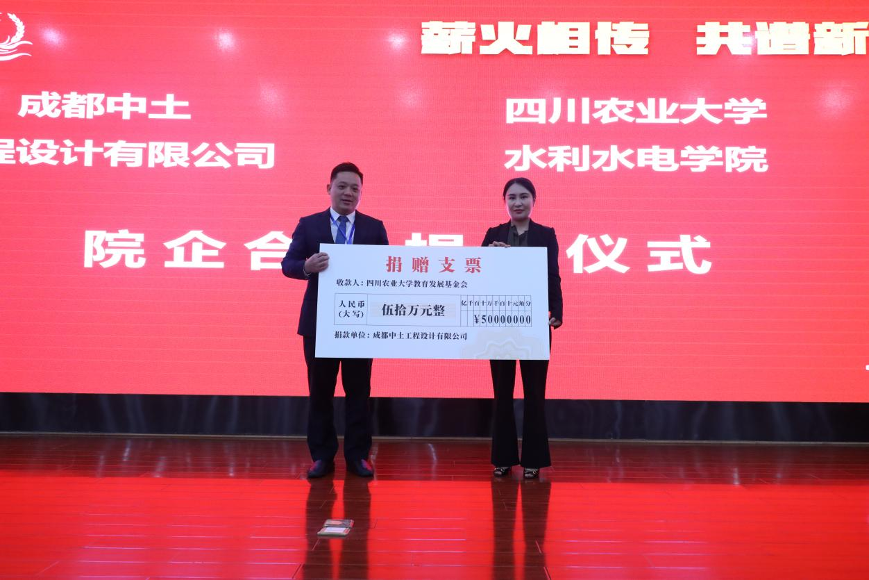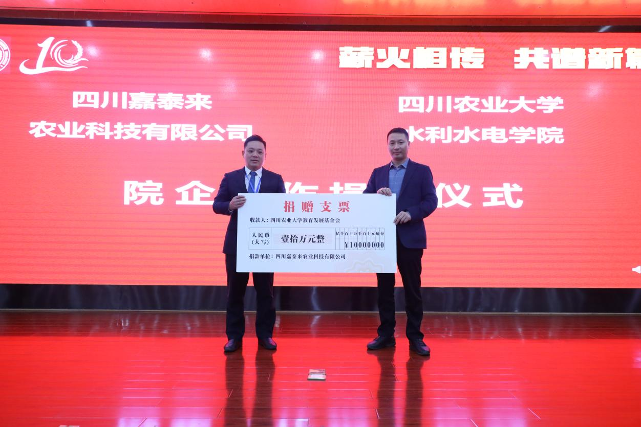 在随后举行的捐赠仪式上,收到四川弘诚天毅工程咨询股份有限公司、成都中土工程设计有限公司、四川嘉泰来农业科技有限公司及校友等共计100万元的捐赠。