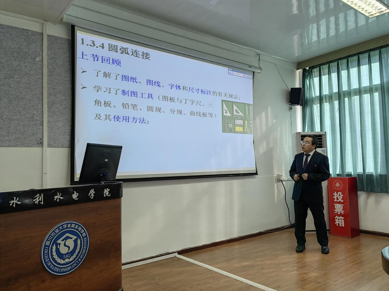 讲课比赛共有9名参赛教师,丰富翔实的教学内容、娴熟的教学技巧充分反映出参赛教师积极、认真、严谨的工作态度。各位参赛老师结合生产生活案例,启发式地知识讲解,充分展现了我院教师良好的个人知识储备和扎实的教学基本功。其中,刘建平老师带来的《工程制图》课程,以水利工程中的“系船钩”为导入,以通俗易懂的方式呈现了如何准确找到连接圆弧的圆心和切点,整堂课程通过流畅精美的教学课件和生动的教学方法,将难度很高的工程制图操作和原理完美呈现,还在潜移默化中贯穿课程思政元素,获得评委们的一致好评。张莹老师主讲的《水利工程制图》课程,在回顾上节课程重点知识点基本视图及向视图的基础上,深入浅出的阐述了本节知识点水工剖视图的画法,系统讲解了图例标注及注意事项,展现出我院青年教师优良的业务素质和良好的精神风貌。佘映军老师主要从水准测量的基本原理、水准测量的仪器、工具使用、测量高差法应用进行了讲解,课堂设计巧妙,各环节环环相扣,层层递进,并巧妙地融入思政元素。
