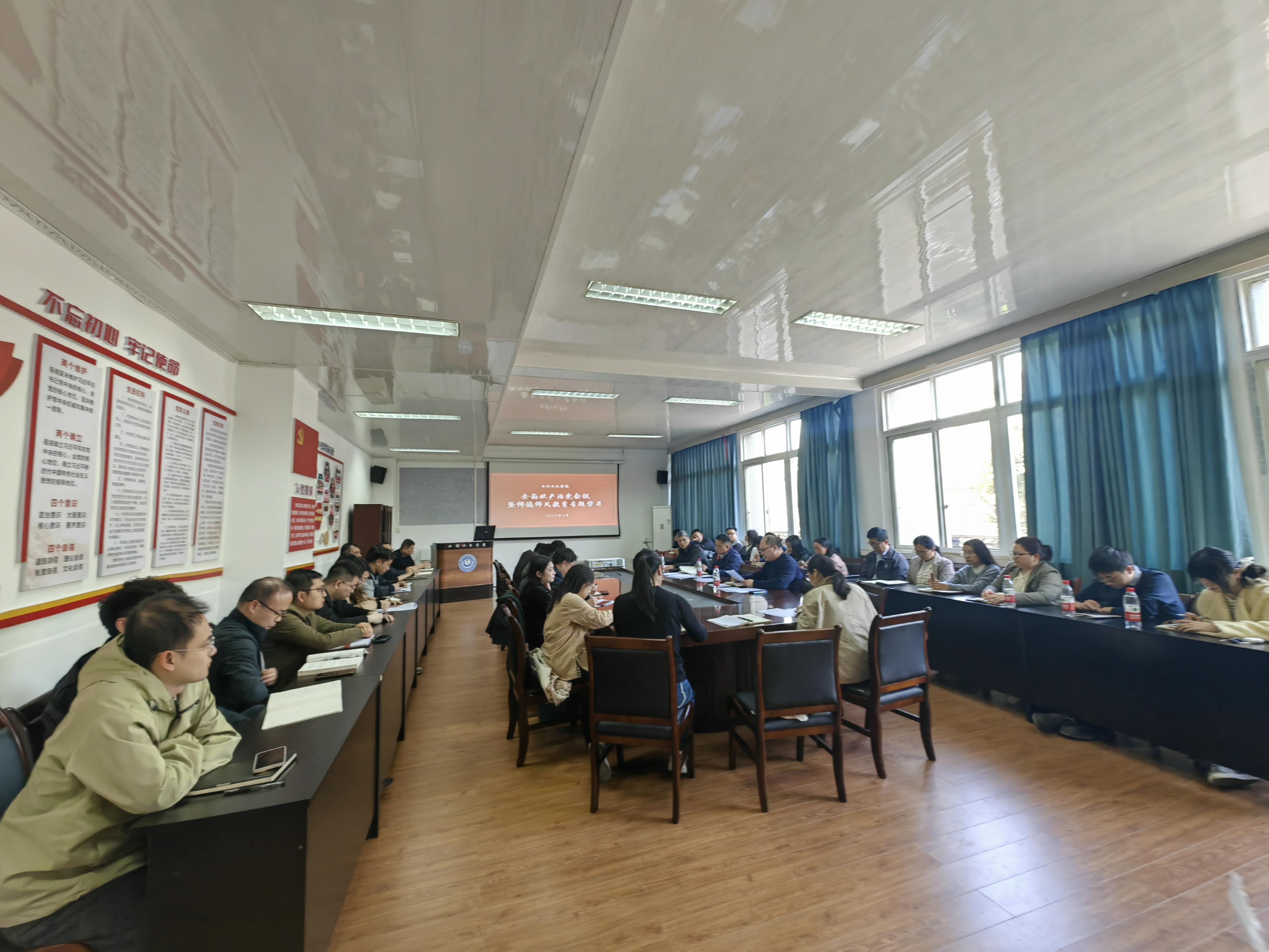 2025年3月26日,学院在4教216会议室举行全面从严治党工作会议暨师德师风专题学习会。会议由学院院长曹迎主持,全院教师参加学习。