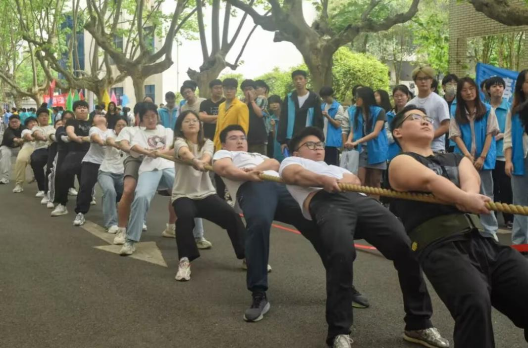 “一!二!拉!”粗粝的麻绳在掌心烙下红痕,却撼不动水院拔河队的决胜之心。后倾的身躯如磐石扎根,紧绷的双臂将力量拧成一股洪流。从战术配合到耐力磨合,他们用血肉之躯演绎“众志化铠,云帆济沧海”。