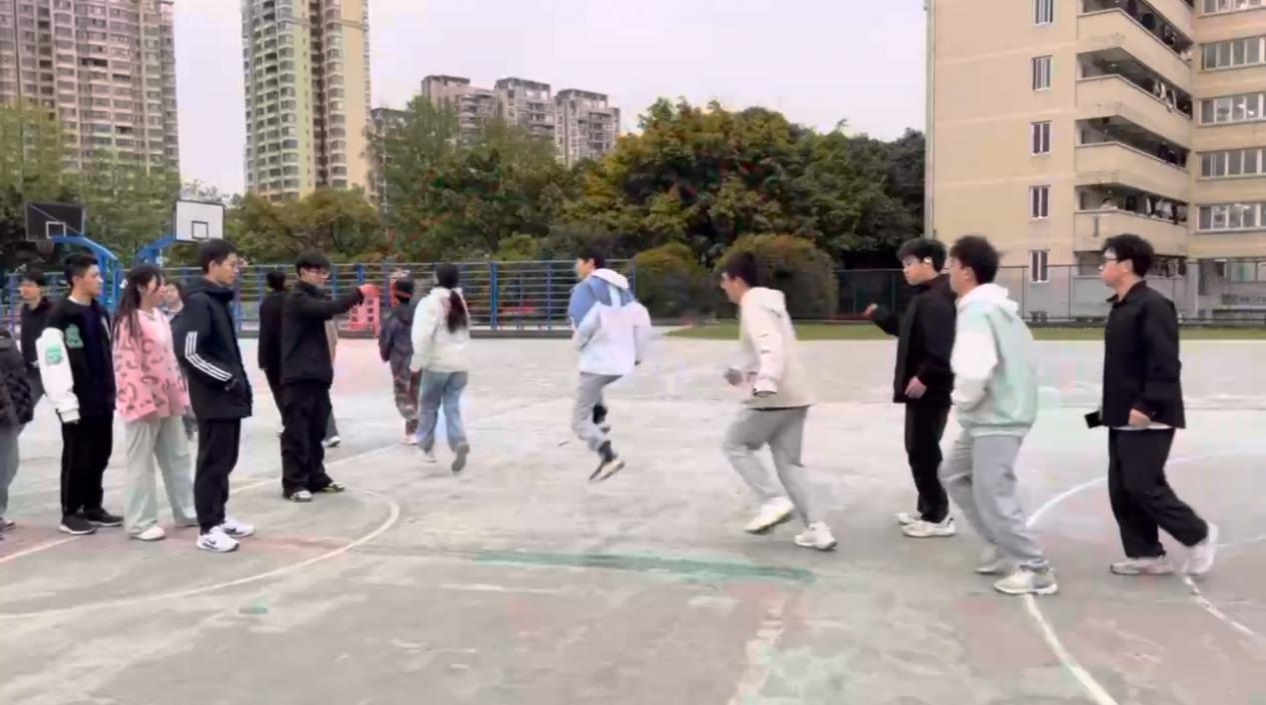 比赛开始前,团队成员提前熟悉场地。在其他学院取得优异成绩的压力下,团队成员互相鼓舞,迅速投入比赛状态。随着裁判哨响,两名摇绳队员默契配合,16名队员,衔接流畅、节奏分明,形成“8”字循环。比赛过程中,队员们目光如炬,踏着“哒—哒—哒”的节奏精准起落,在6次死绳的不利状况下依旧发挥稳定,取得417个的优异成绩。