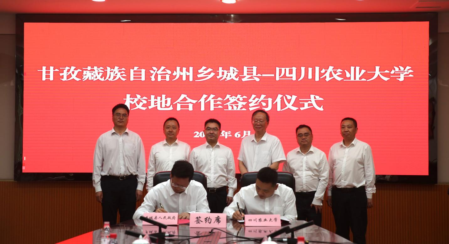 2025年6月16日上午,学院与甘孜州乡城县校地合作签约仪式在雅安校区逸夫楼举行。甘孜州副州长袁纲、乡城县委书记杨林,县委常委、常务副县长黄万明及州县相关部门负责人,学校校党委副书记张强、科技处处长田孟良、乡村振兴学院直属党支部书记向兵、学院全体班子及相关系室主任参加签约仪式。签约仪式由学院党委书记马海主持。