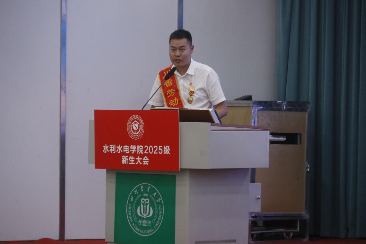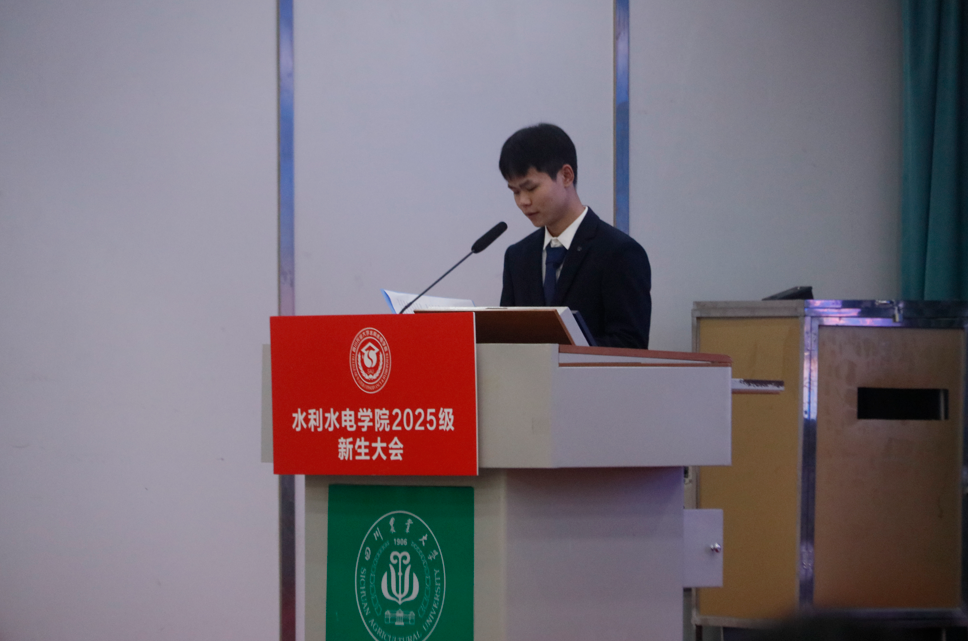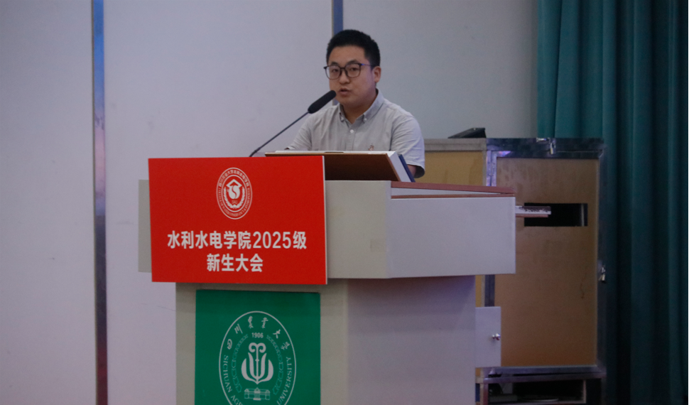 教师代表李基栋副教授随后上台发言。作为深耕水利领域多年的资深学者,他结合自身科研与教学经历,从专业视角为新生剖析了水利水电行业的发展现状与未来前景。他指出,当前国家在水资源优化配置、清洁能源开发等领域对专业人才需求迫切,鼓励新生既要打牢数学、力学等基础学科知识,也要主动关注行业前沿动态,培养跨学科思维与解决复杂工程问题的能力。同时,李基栋叮嘱同学们,大学不仅是知识学习的殿堂,更是品格塑造的课堂,希望大家在钻研专业的同时,学会协作、懂得坚持,以扎实的学识与坚定的信念,为未来投身水利事业做好充分准备。