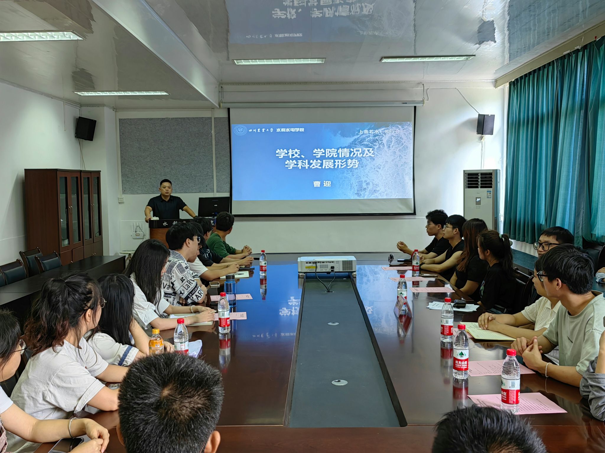 曹迎首先讲述了川农大的历史沿革与辉煌成就,从1906年四川通省农业学堂,到进出国立四川大学,再到迁往雅安建院,再到首批进入国家211工程建设高校队伍,他以深入浅出的方式回顾了杨开渠、杨允奎、杨凤、周开达等老一辈川农人作出的努力和探索,讲述了江泽民总书记两度来校视察,温家宝总理批示川农大精神,习近平总书记视察我校眉山水稻种植基地等党和国家领导人关怀。系统梳理了当前川农大ESI全球前1%学科、国家重点培育学科、博士学位授权一级学科等学科建设情况。随后,梁心蓝立足学院发展情况,围绕学院发展历程、机构设置、培养体系、平台条件、学科建设发展情况等方面介绍了学院概况,重点阐述了学院从2014到2024,通过十年奋斗逐步实现特色鲜明、全面发展的创业历程。罗磊结合学院研究生专业背景,讲解了中国水资源概况、水资源时空分布特征、水资源开发利用以及四川面临的水资源形势与挑战,建议同学们深化专业基础学习,拓展实践经验,培养跨学科思维与能力,并关注行业动态与技术前沿。祝愿全体研究生在研途生活愉快,学有所成。