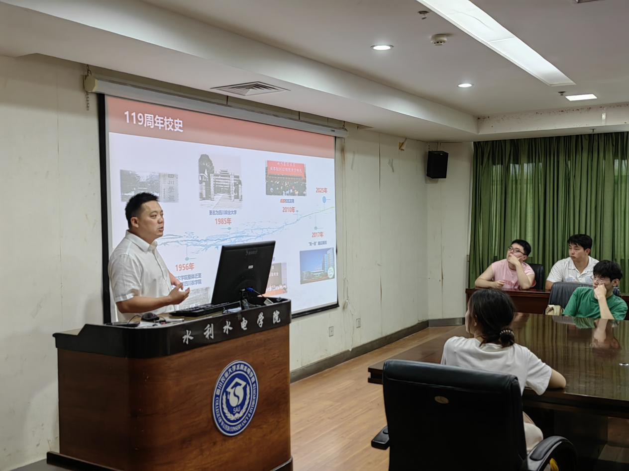学院院长曹迎教授进行入学教育第一讲,系统梳理了当前川农大ESI全球前1%学科、国家重点培育学科、博士学位授权一级学科等学科建设情况,介绍了学院学科发展脉络、研究团队以及水工、水文、能源等重点方向,号召同学们紧跟导师步伐,早作谋划、早出成果。