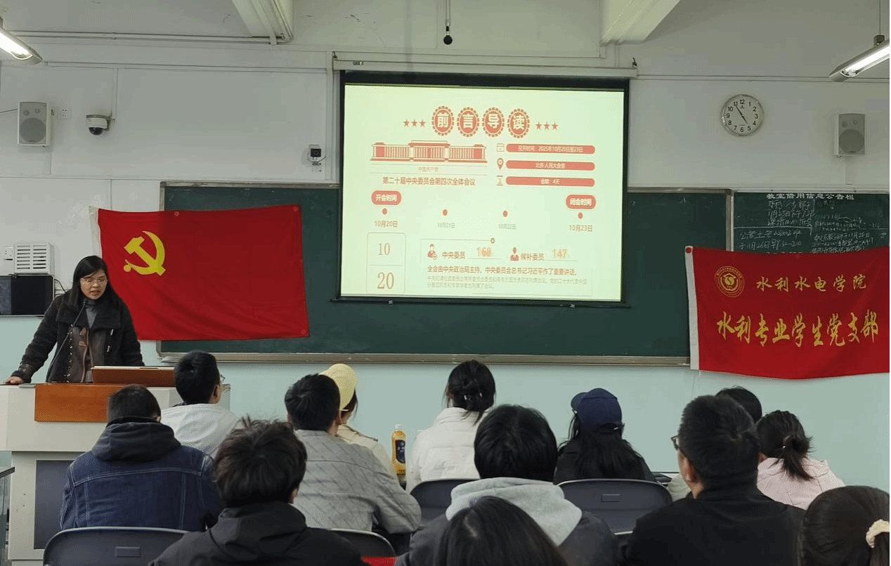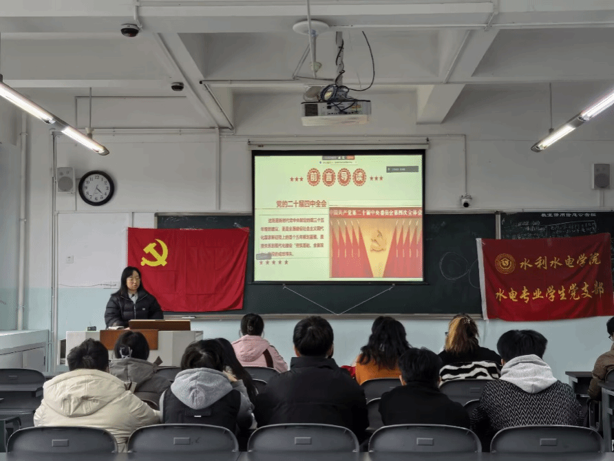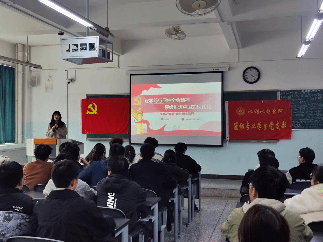 为深入学习贯彻党的二十届四中全会精神,引导青年学生准确把握全会的丰富内涵与核心要义,进一步用全会精神武装头脑、筑牢信仰根基,11月25日—12月9日,学院辅导员李建华、杨丽萍、胡芮华、赵思越,分别为能动专业学生党支部、水利专业学生党支部、水电专业学生党支部和研究生党支部党员讲授“深入笃行四中全会精神 接续推进中国式现代化”党的二十届四中全会精神专题辅导会,系统解读党的二十届四中全会核心要义与实践要求,推动全会精神在青年党员中入脑入心、见行见效。