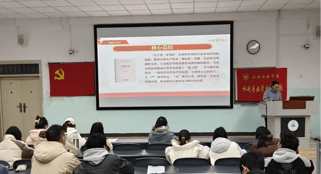 为深入学习贯彻习近平总书记关于党的自我革命的重要思想,切实把 “五个进一步到位”要求落实到学生党员教育管理和专业实践中,12月9日下午,水利专业学生党支部开展了“深入学习领会‘五个进一步到位’纵深推进党的自我革命”主题党日活动。本次党日活动在10教A303开展,水利专业学生党支部全体党员参加。