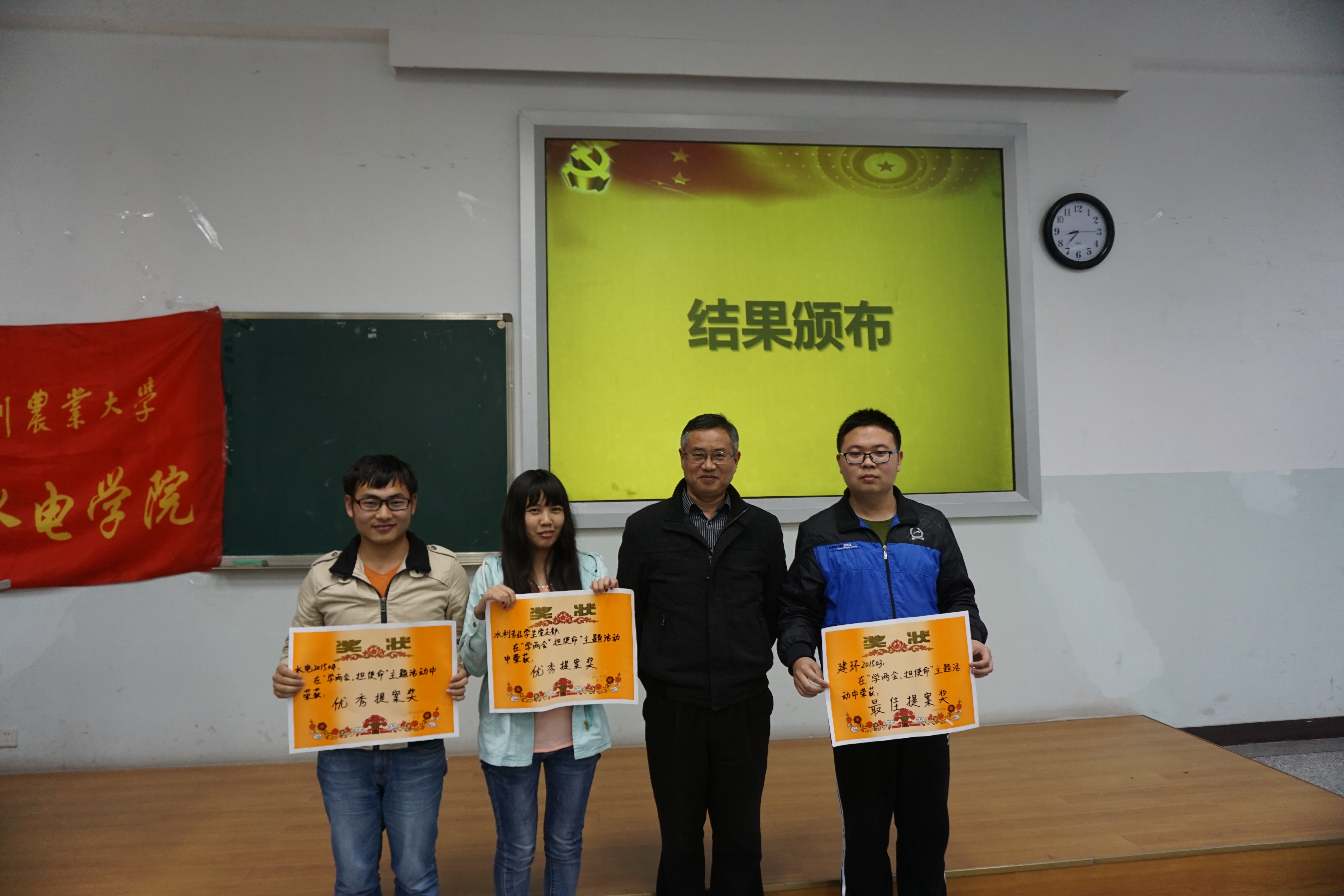 激烈角逐之后,经过评委们讨论,最终,建环201503团支部的《关于建议在我校加强书法教育弘扬传统文化的提案》在众多参赛队伍中脱颖而出,获得“最佳提案奖”荣誉称号,水电201504团支部的《关于提高短期支教队伍的素质的提案》、水利专业学生党支部的《关于加强大学生宿舍安全建设的提案》分别获得“优秀提案奖”荣誉称号。随后,学院党委书记曾小波为获奖支部代表颁发奖状,并送上赞扬话语。
