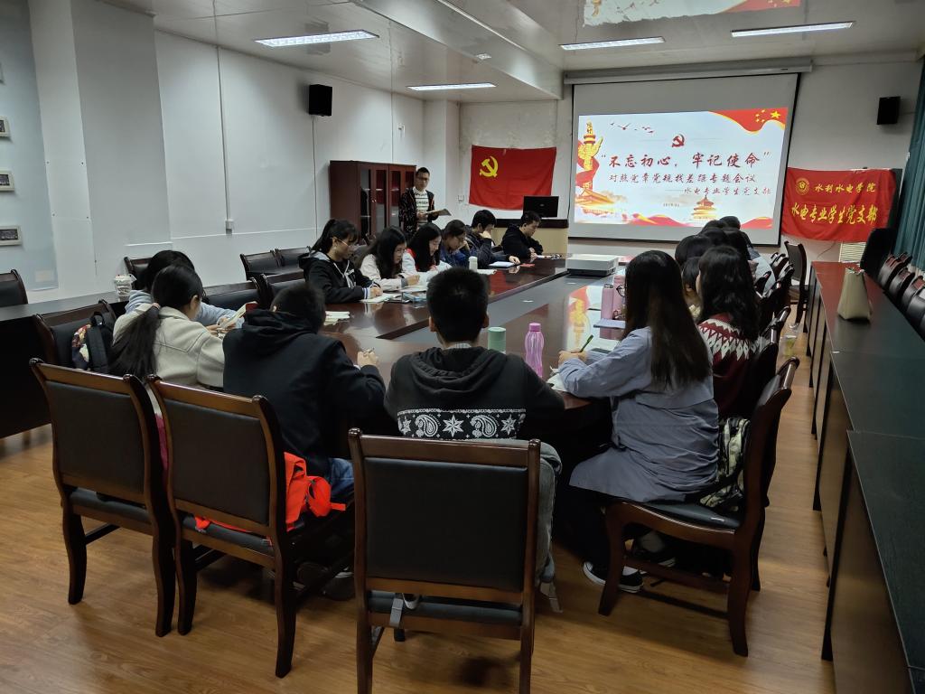 为积极响应中央“不忘初心、牢记使命”主题教育领导小组印发的《关于在“不忘初心、牢记使命”主题教育中对照党章党规找差距的工作方案》要求,11月8日晚,水利水电学院水电专业学生党支部于四教216会议室召开了对照党章党规找差距专题会议,会议由党支部王旭同志主持,水电学生党支部全体成员出席会议。