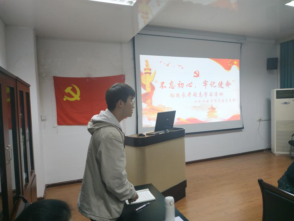 11月9日,依据学校《“不忘初心、牢记使命”主题教育工作计划》相关部署安排,为进一步营造学习先进、争当先进的浓厚氛围,提高党员党性修为;水电、水利、建环学生党支部于四教216组织观看了“周永开同志先进事迹专题片”,共60余名党员同志观影学习,各支部小组讨论发言。王旭主持观影活动。
