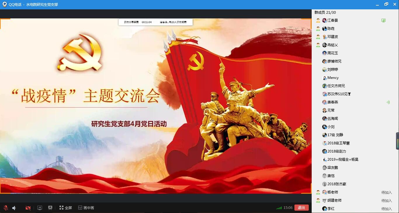 在疫情防控期间,为提高学生党员的理想信念,加强党员奉献社会的意识,4月28日晚,研究生第一党支部、研究生第二党支部联合开展了“战疫情”为主题的党日活动,此次活动在支部副书记江春景同志的主持下由视频通话线上进行。