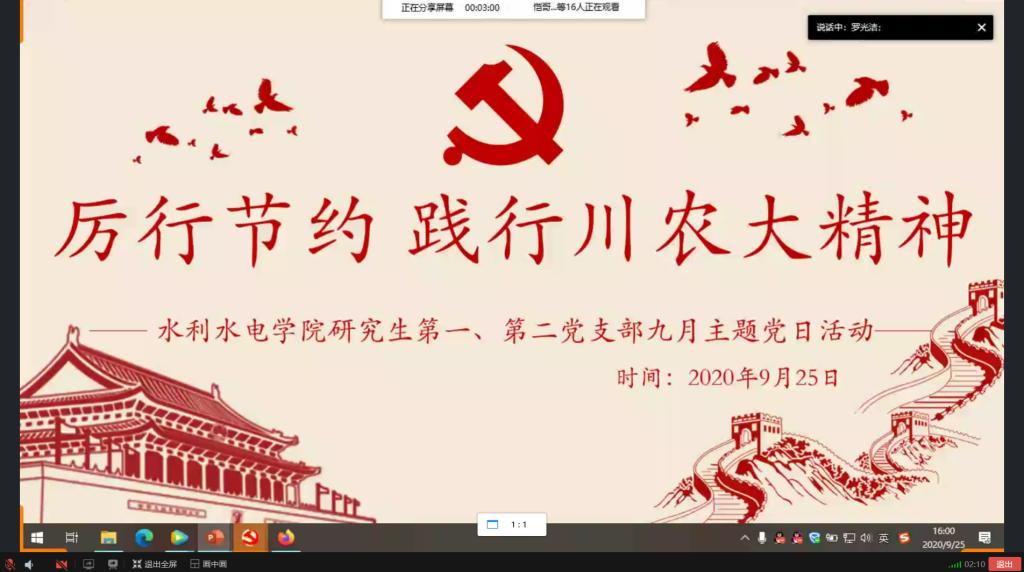 为了弘扬中华民族节约粮食精神,强化研究生党员节约粮食意识,2020年9月25日下午4点,水利水电学院研究生第一、第二党支部开展了“厉行节约,践行川农大精神”线上主题教育党日活动,水利水电学院研究生第一、第二党支部全体党员参加此次活动,活动由第二党支部副书记罗光洁同志主持。