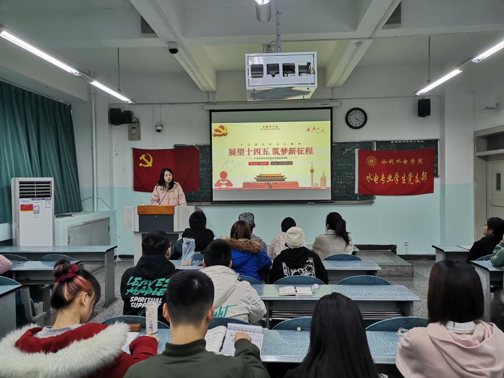 为了让支部同志们更好的学习贯彻党的十九届五中全会精神, 2020年11月22日下午,水利水电学院水电专业学生党支部开展了“展望十四五,筑梦新征程”主题党日活动。水利水电学院水电专业学生党支部全体同学参加本次活动,杜红宇同志担任主持人。