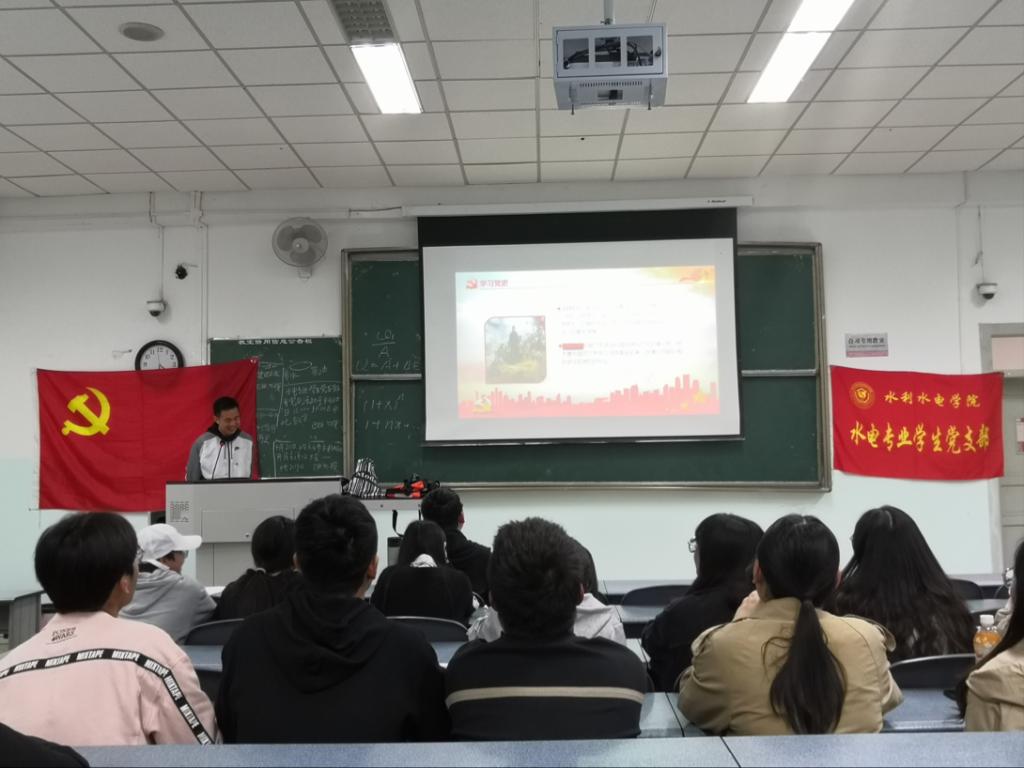 为响应习近平总书记“在全党开展党史学习教育”的号召,深刻领悟李克强总理代表国务院在第十三届全国人大第四次会议上作的《政府工作报告》,2021年4月20日下午,水电专业学生党支部在十教A402开展“学习党史展望未来”主题党日活动,邹瑜同志担任主持人。