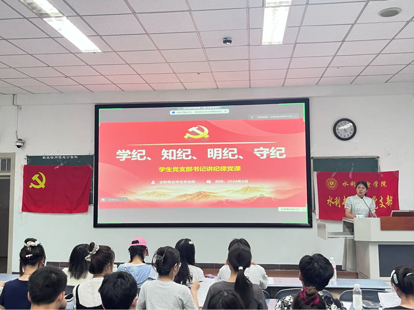 为深入学习党规党纪,引导广大党员深刻认识党规党纪的重要性,严守党的纪律底线,6月17日,学院水利专业学生第一、第二党支部于10-A203开展“懂法规、明规矩、知敬畏、存敬畏”——党纪学习教育主题党日活动,党委办公室主任、水利专业学生第一党支部书记李建华及水利专业全体党员共计30余人参会。