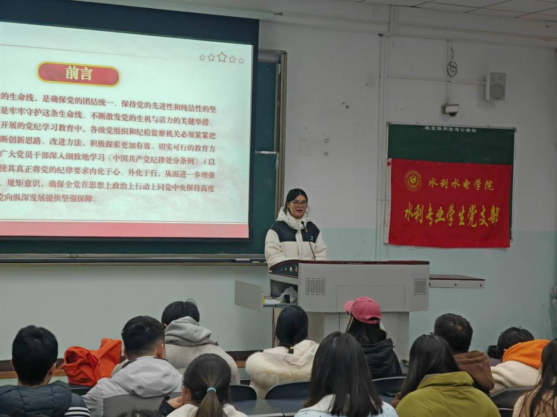 为深入学习贯彻党的纪律建设要求,增强党员纪律意识,近日,水利专业学生党支部组织开展了以“把党纪学习教育融入日常、抓在经常——以学纪、知纪、明纪、守纪正行”为主题的12月党日活动,水利专业学生第一、第二党支部共计34名党员参加。