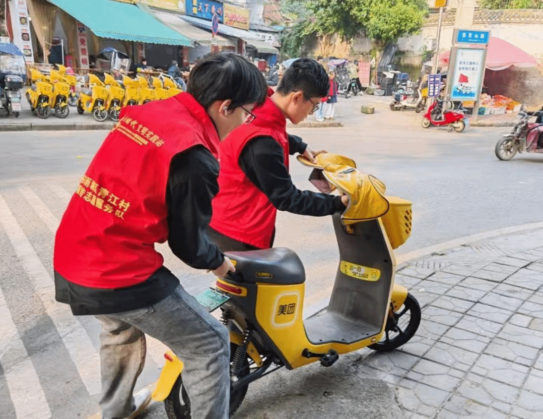 活动现场,志愿者迅速分为两组行动。一组向过往居民和学生递发图文倡议书,手指展板讲解乱停乱放的安全风险;一组手持手套,沿村内主干道、居民楼道逐一巡查,对违规停放的电动车,轻扶车把引导车主挪至指定区域,对无人认领的车辆,两人一组小心抬运,整齐摆放在临时停车区,并贴上写有“请规范停放”的温馨提示。遇到老年村民,志愿者反复叮嘱安全注意事项。