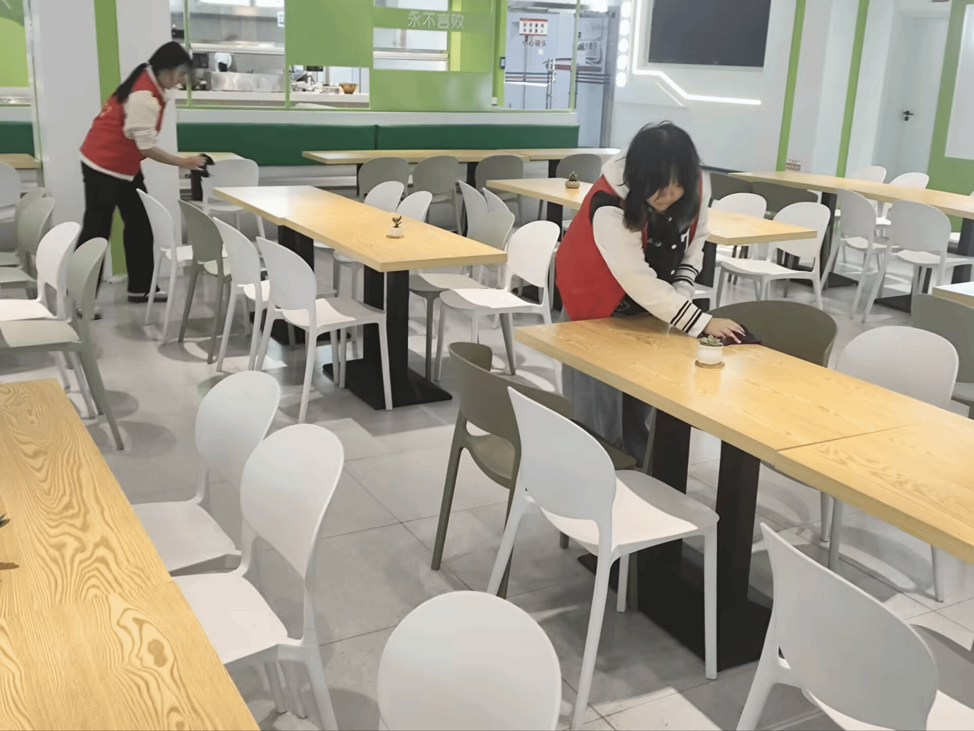 经过两小时的辛勤付出,杏苑餐厅内所有餐桌均焕然一新,桌面无污渍、无异味,为后续就餐的师生提供了干净整洁的环境。食堂工作人员对志愿者们的热心帮助表示诚挚感谢:“用餐高峰后清洁压力大,同学们的志愿行动既减轻了我们的负担,也为校园文明树立了好榜样。”参与活动的志愿者林雅贞表示:“亲手把脏乱的餐桌打扫干净,看着大家在整洁环境中就餐,既体会到了劳动的成就感,也更懂食堂工作人员的辛劳。”
