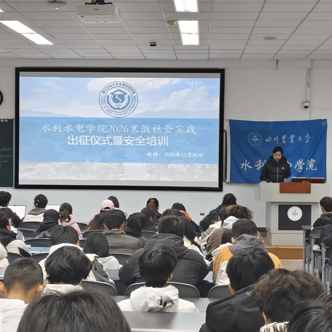 袁梦凡为 “彝乡润源” 团队授旗,林琪云为 “蓝色水足迹” 团队授旗,两面旗帜象征着青年使命与责任的传递。作为校级重点团队代表,“蓝色水足迹” 队长高琪做出征宣言。她表示,74 名跨学科成员将奔赴雅安雨城区清江街道,聚焦流域灾害预警、节水知识普及等任务,以无人机遥感结合实地勘察的方式,践行 “把论文写在祖国大地上” 的誓言。能源与动力专业学生易雪琪作为个人实践代表发言,分享了返乡南充开展高校宣传、传播川农精神的实践计划,展现了个人实践的独特价值。