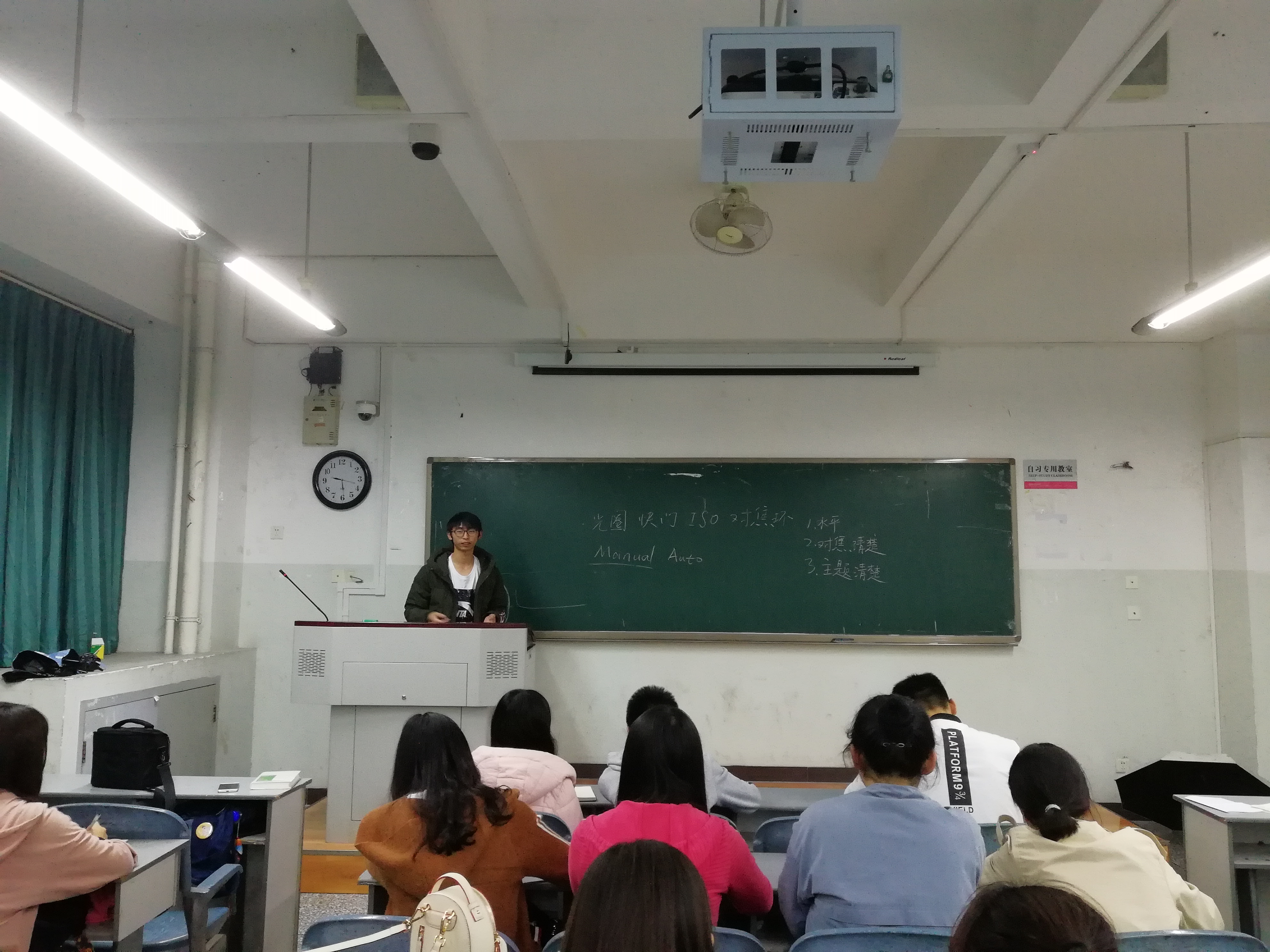 作为电视媒体工作部的委员和一名摄影爱好者,肖照炜对于摄影有着自己的见解。在培训过程中,他就摄影的基本要素、摄影构图法及后期处理等方面进行详细的讲解。他提到,拍照要讲究位置水平、对焦清楚、主题明确。除了现场为大家演示摄影过程,他还拿出一些自己的摄影图片与大家分享在拍摄时的小技巧,让大家能够更好地理解,继而融会贯通。此外,肖照炜鼓励大家多欣赏一些文学作品、优秀摄影作品等,在潜移默化中提高个人的审美水平,有利于拍摄出好的照片。在培训最后,肖照炜为到场的学生干部送上“干货”,推荐了一些关于摄影方面的公众号和操作简便的图片后期处理APP。