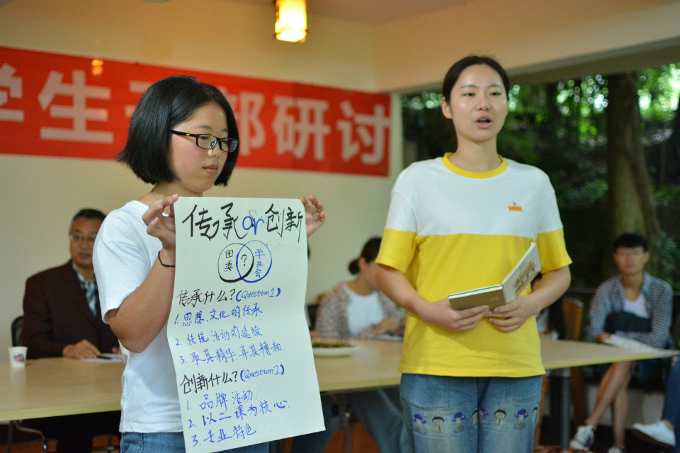会议开始,上届主席团对其在任期间的工作进行了深刻的总结,并对学院书记,老师与共事的伙伴表达了深厚的感谢,对新任干部提出了指导性的建议。他们提出,对于干部作风问题,一切皆有度,一切皆有法,权力与义务共生,学生干部应当严格律己,以德为先,做好学生榜样,诚实守信,发挥自身主观能动性,做好学生服务工作。聚是一把火,散是满天星,部门内部需要团结合作,在部门之中营造家文化,增强部门凝聚力。之后,学生干部各小组就“学院如何做好传承与创新”,“如何调动学生干部的工作热情”,“学风建设应该怎样开展才能更有效”,“学生会内部建设如何进一步提高”和“新媒体工作室工作应该如何进行”这五个议题展开了详细的讨论,并在讨论结束后向与会人员展示了讨论成果。