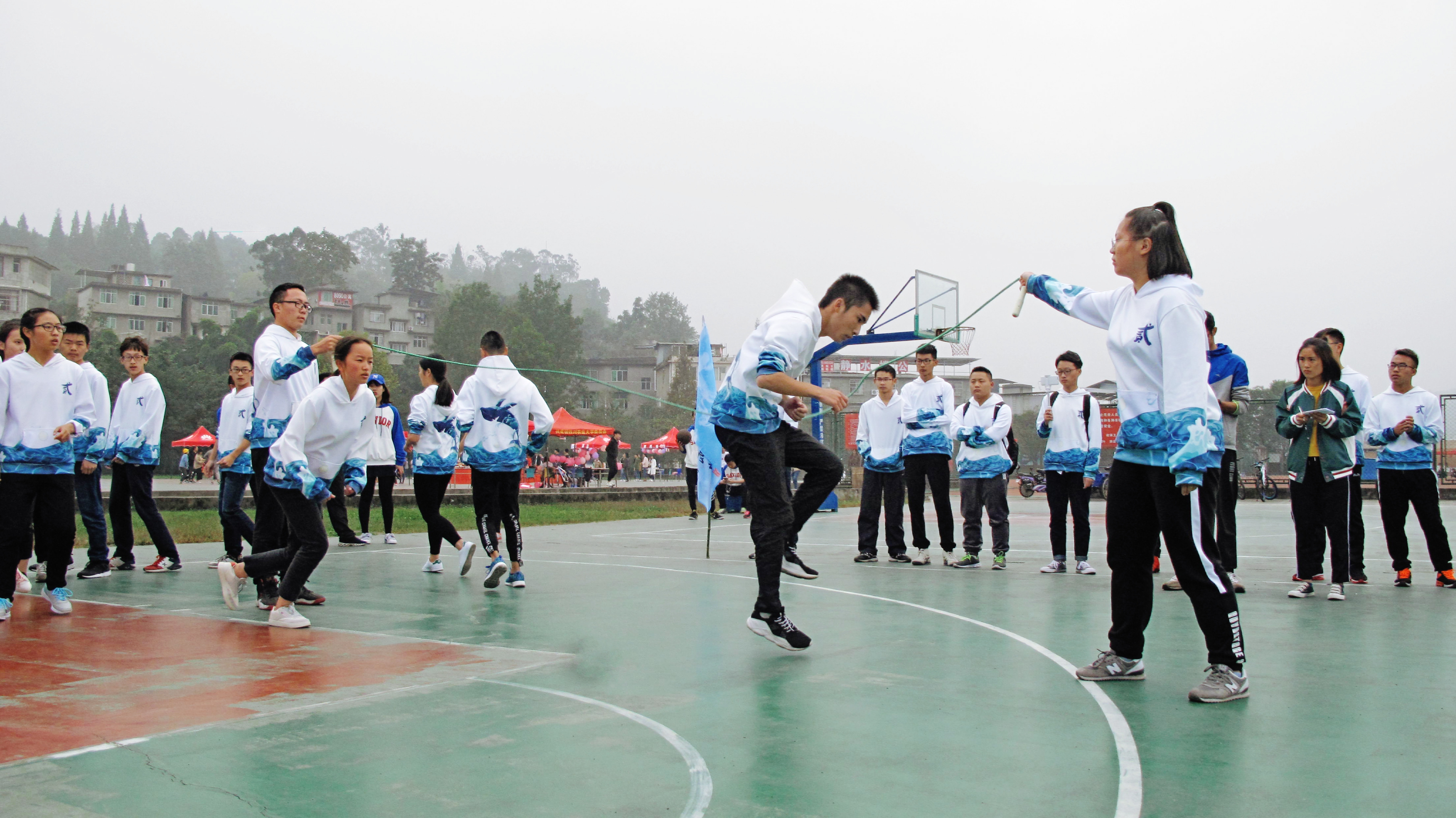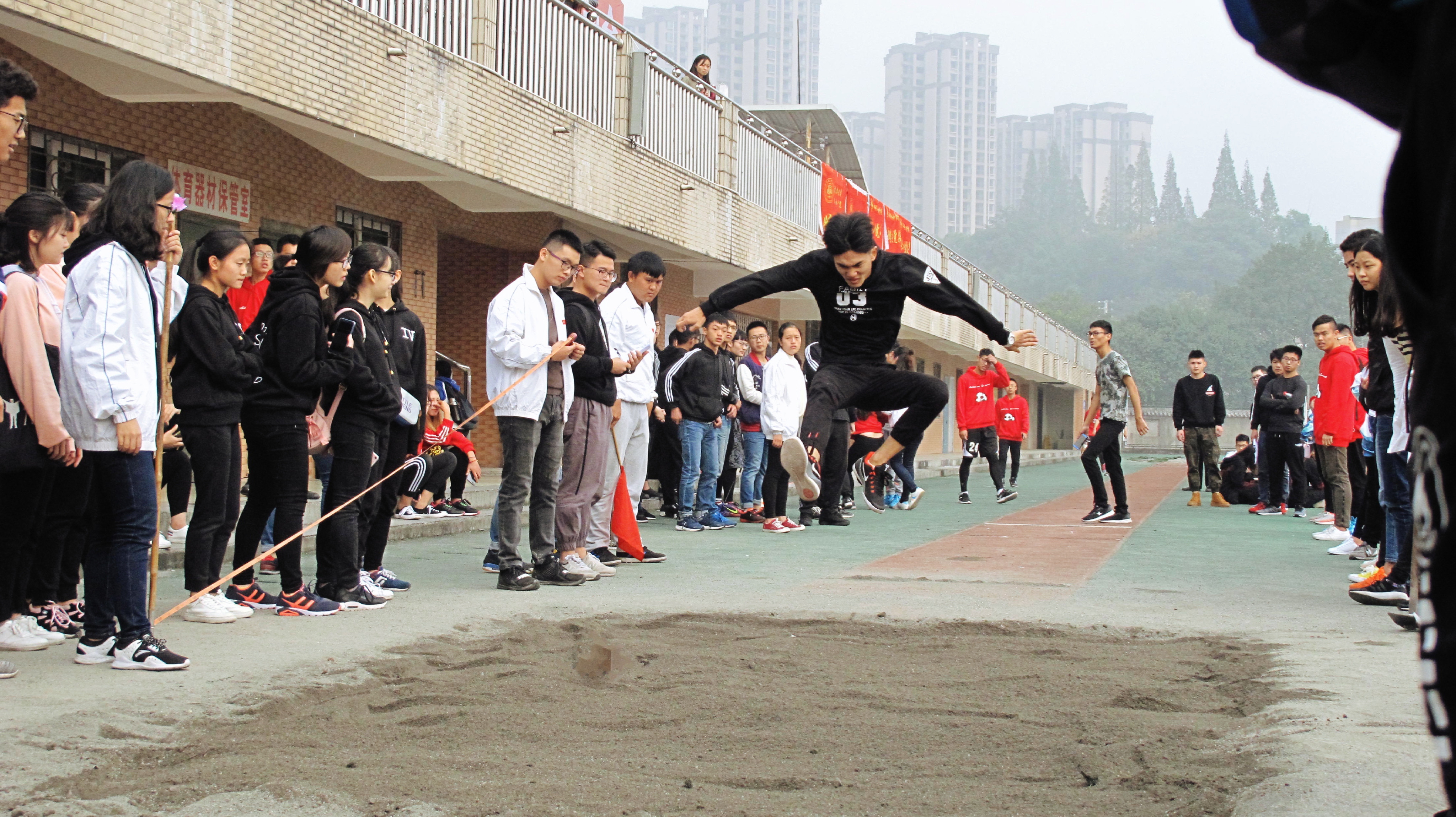跑道上,随着第一项单人比赛项目男子100m预赛的枪响,一个个年轻的身影似骏马、似离弦之箭奋力冲刺;沙坑旁,随着发令旗一挥,运动健儿们舒展身姿,高高跃起,用行动践行着 “更高、更快、更强”。随后,各项田赛、径赛、团体赛也纷纷开展起来。据悉,本次运动会设有男女田径单项:100m、200m、400m、跳远、三级跳、4×100m接力赛以及四项团体赛,分别是广场舞、拔河、跳绳、10×60米迎面接力,其中广场舞比赛共三种背景音乐,由各小班通过抽签选择。