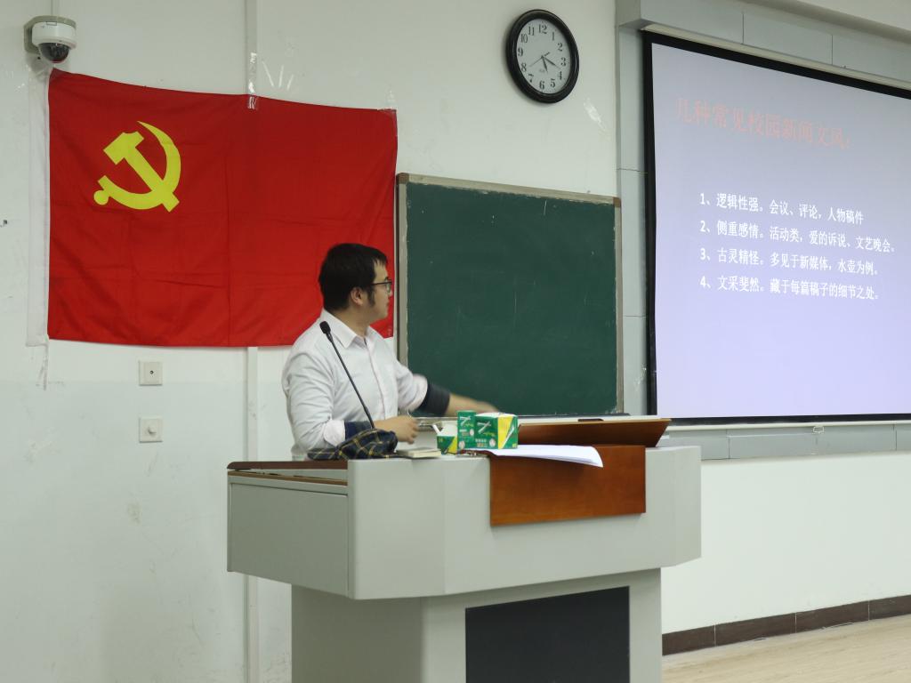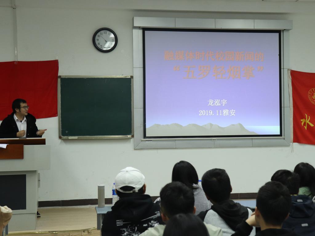 培训会由团委学生副书记刘振兴主持。会议伊始,龙泓宇引用天龙八部中“五罗轻烟掌”来概括写好一篇新闻稿的五大要点:绚丽夺目的标题、优质的结构、得当的新闻图片拍摄、适于不同类别稿子的斐然文风及真情实意的写稿态度。其中,他着重强调写稿的基本功:六大要素与五大部分,又附以典型新闻稿进行举例讲解,深入浅出。