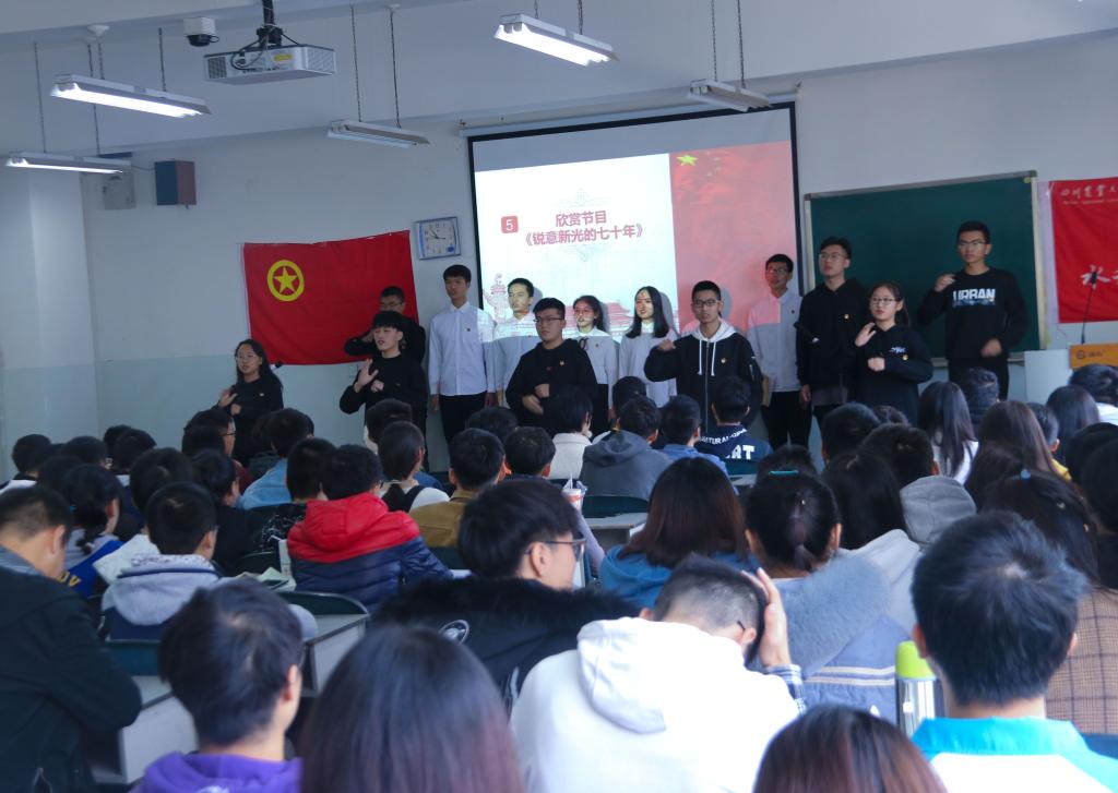 奏唱团歌完毕后,同学们在视频《祖国七十年的变化》中回顾历史,并就主持人提出的问题进行积极抢答。随即,胡敏伦围绕共青团简介和基层共青团组织工作两部分内容进行讲解,带领同学们认真学习团徽、团旗与团歌的历史及由来。胡敏伦重点强调了推优入党条件中的“无重修补考现象”,并就此鼓励同学们刻苦、认真学习,希望同学们能努力完善自己成为一名合格的共青团团员。