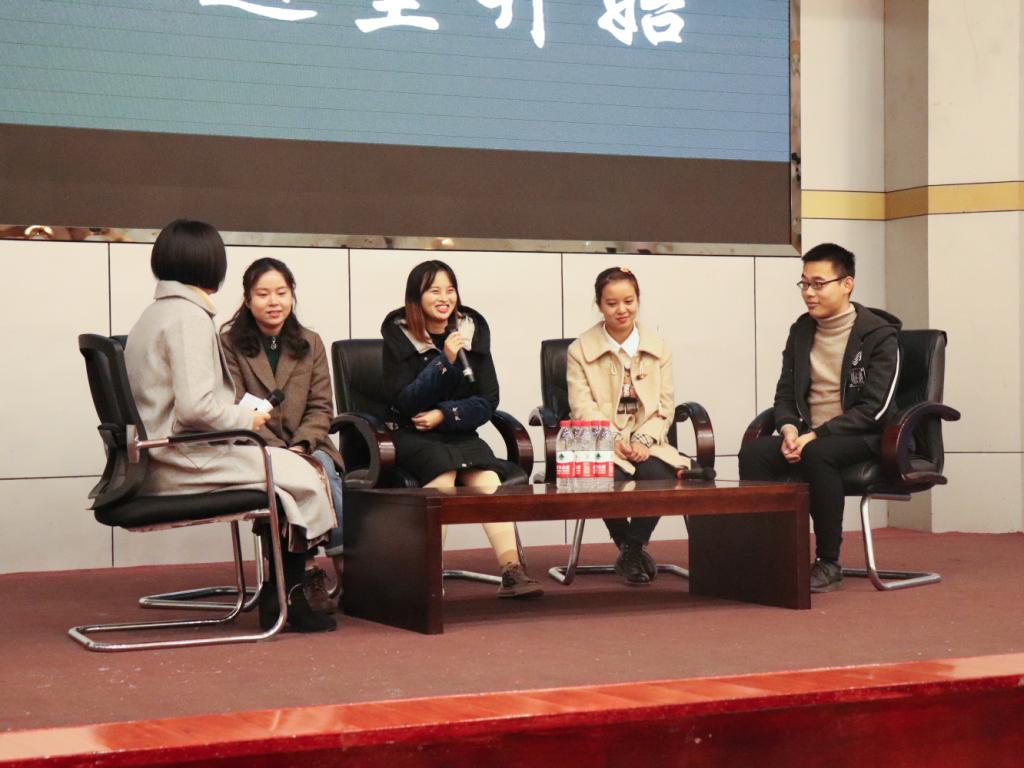 活动伊始,主持人谭娅玲播放了一段关于大一、大二学生对大学生活的看法和疑问的采访视频,然后向四位优秀学生提出“对大学最初印象”这么一个问题作为开场来引出分享会活动。