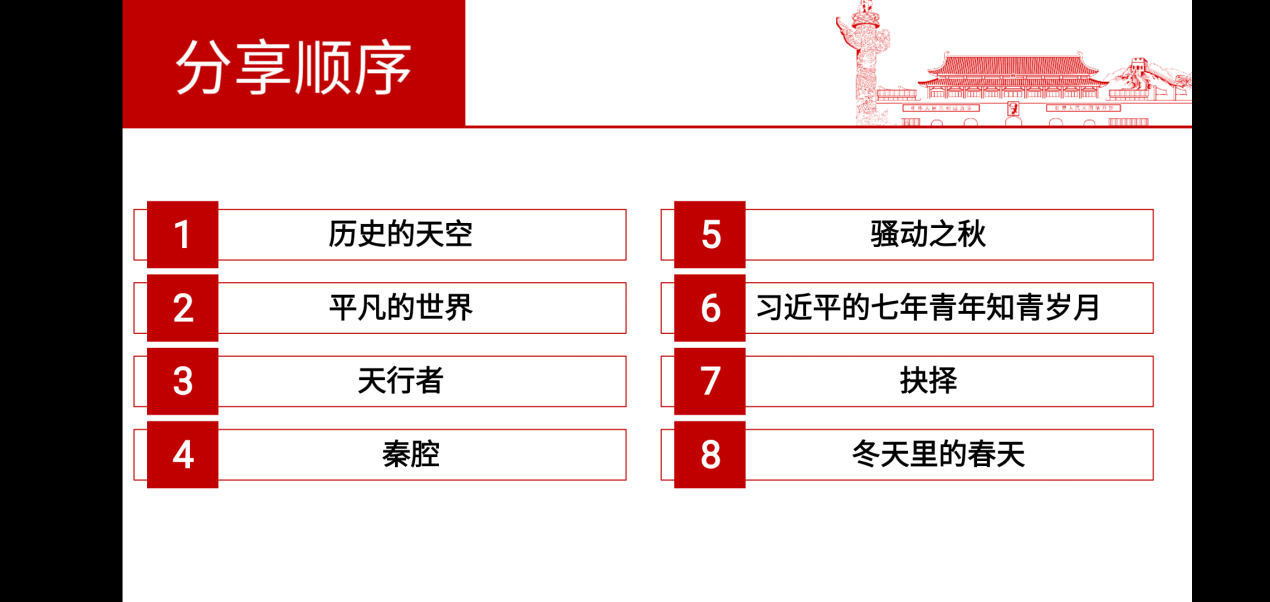 会上,各小组代表通过PPT汇报的形式从时代背景、内容简介、思想传达、阅读感悟几个方面依次进行分享。其中,第七组的沈小慧在分享时说道:“读完《平凡的世界》后,让我明白尽管命运是那样的曲折,尽管社会有那么多的不公,可只要我们能够不屈不挠、艰苦奋斗、勇往直前,终能获得最后的成功。”《先行者》里讲了一群乡村教师扎根底层的故事,第五组的皮正果分享到:我敬重这些乡村教师,他们可能是物质上的贫困者,却又是精神上的富有者。正是因为这群先行者,推进了一代人的教育事业。读完《抉择》后,第三组的同学分享了读书感悟:人生最慎重的行为是抉择,抉择对于我们有很多次,而每一次进行抉择时都应当心怀崇高信仰。