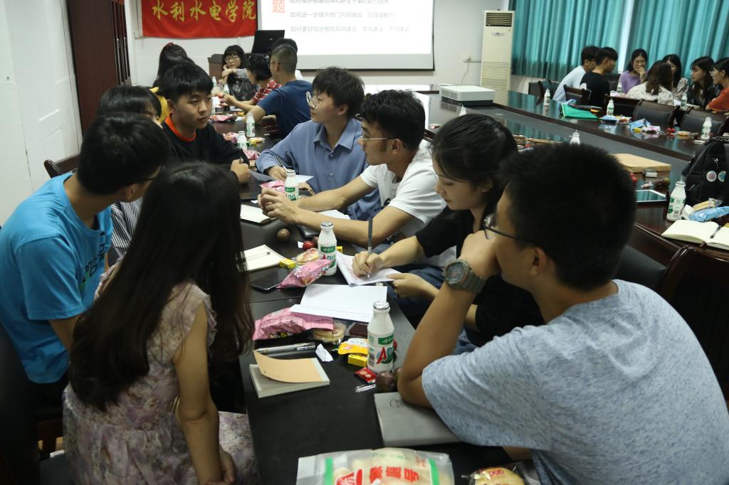 随后大会第四项,全体学生干部分组对如何进一步提高学院学生工作的开展进行讨论。上一届主席团成员和与会老师们也参与到同学们的讨论中,对同学们进行引导和提出意见,也对同学们在讨论过程中的疑问及时解答。经过三十分钟的深入讨论之后,五个小组各派出一名代表进行总结分享。针对如何做好换届指导和新生干事的能力培养。第一小组同学提出干事委员一起培养的新构想,让新生干事们化被动为主动,进行角色转换。此次讨论也对迎新工作提出了建议和创新:制作报道流程视频使新生更容易理解流程;提前统计好报道时间,有利于提前做好志愿者的分配;当新生父母在报到处等待孩子们时,可以组织父母写下对孩子的寄语,开学后再转交给同学们,有了父母的寄语,暖心更暖行。