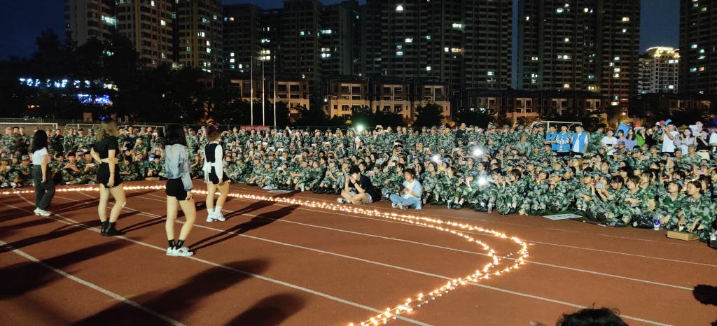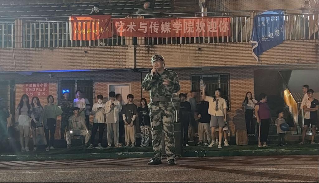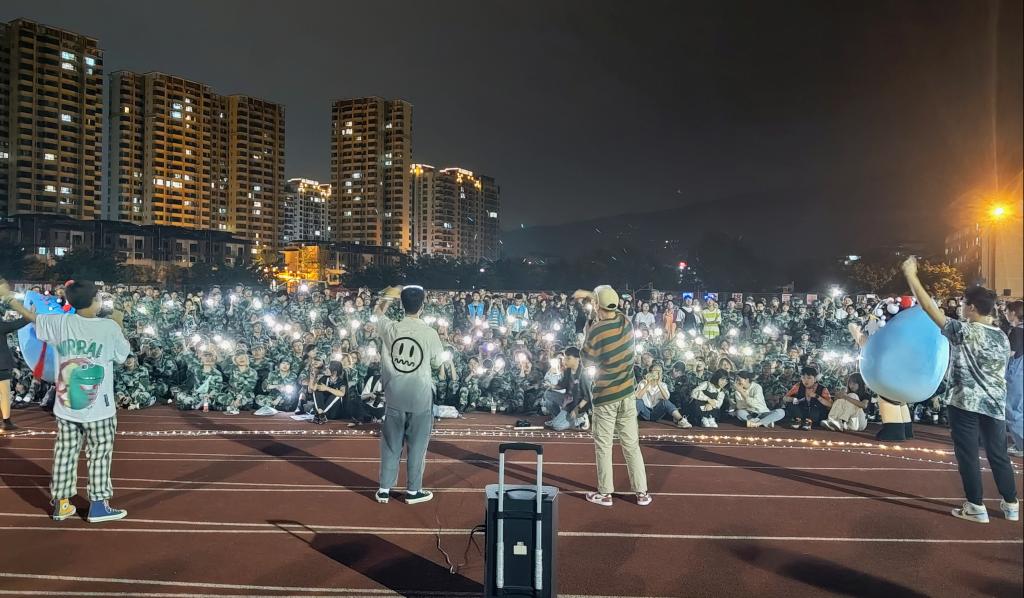 穿着军训服的新生举起手电筒为演出的师兄师姐打call