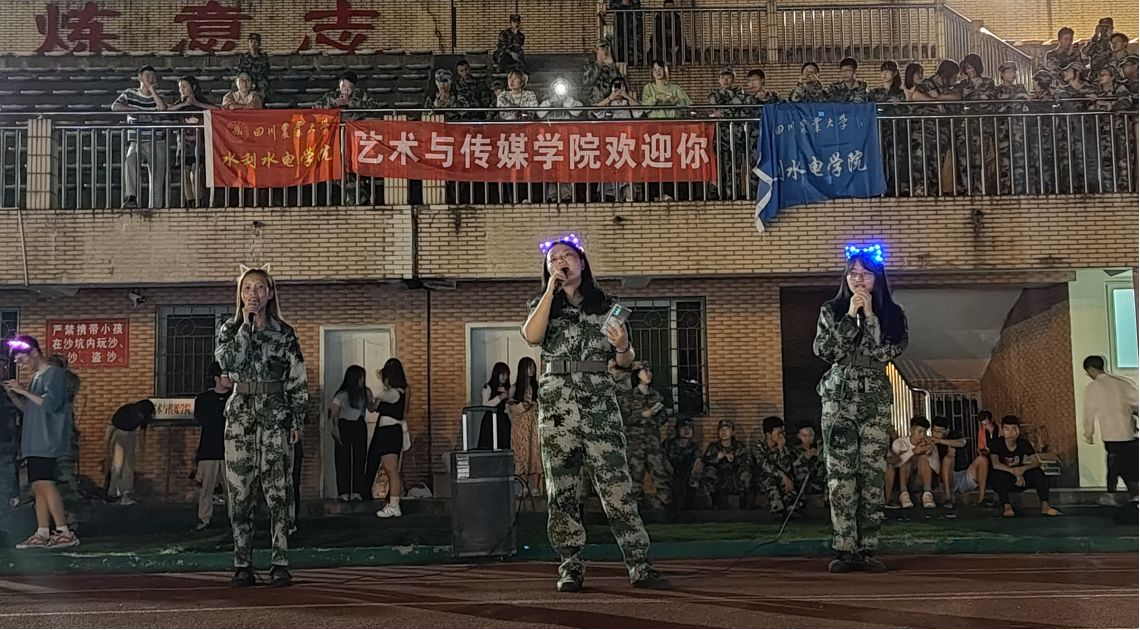新生军训慰问表演,当然也少不了新生节目代表的身影。只见三个可爱的新生女孩子用婉转柔情的歌喉共同演唱的《永不失联的爱》煽情而动人;也有隐藏在观众席里的“神秘嘉宾”即兴演唱《大鱼》用假音震惊全场。