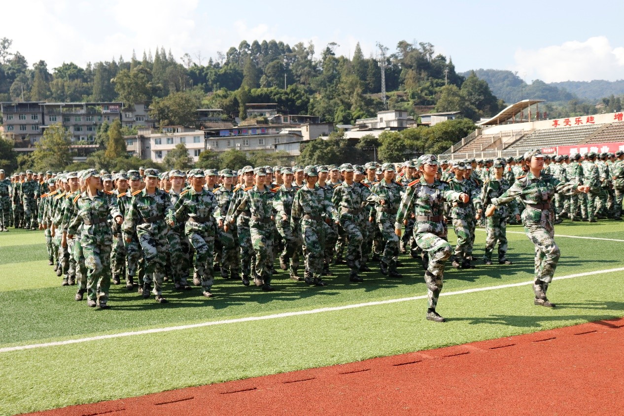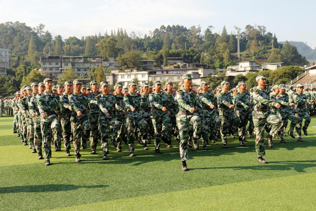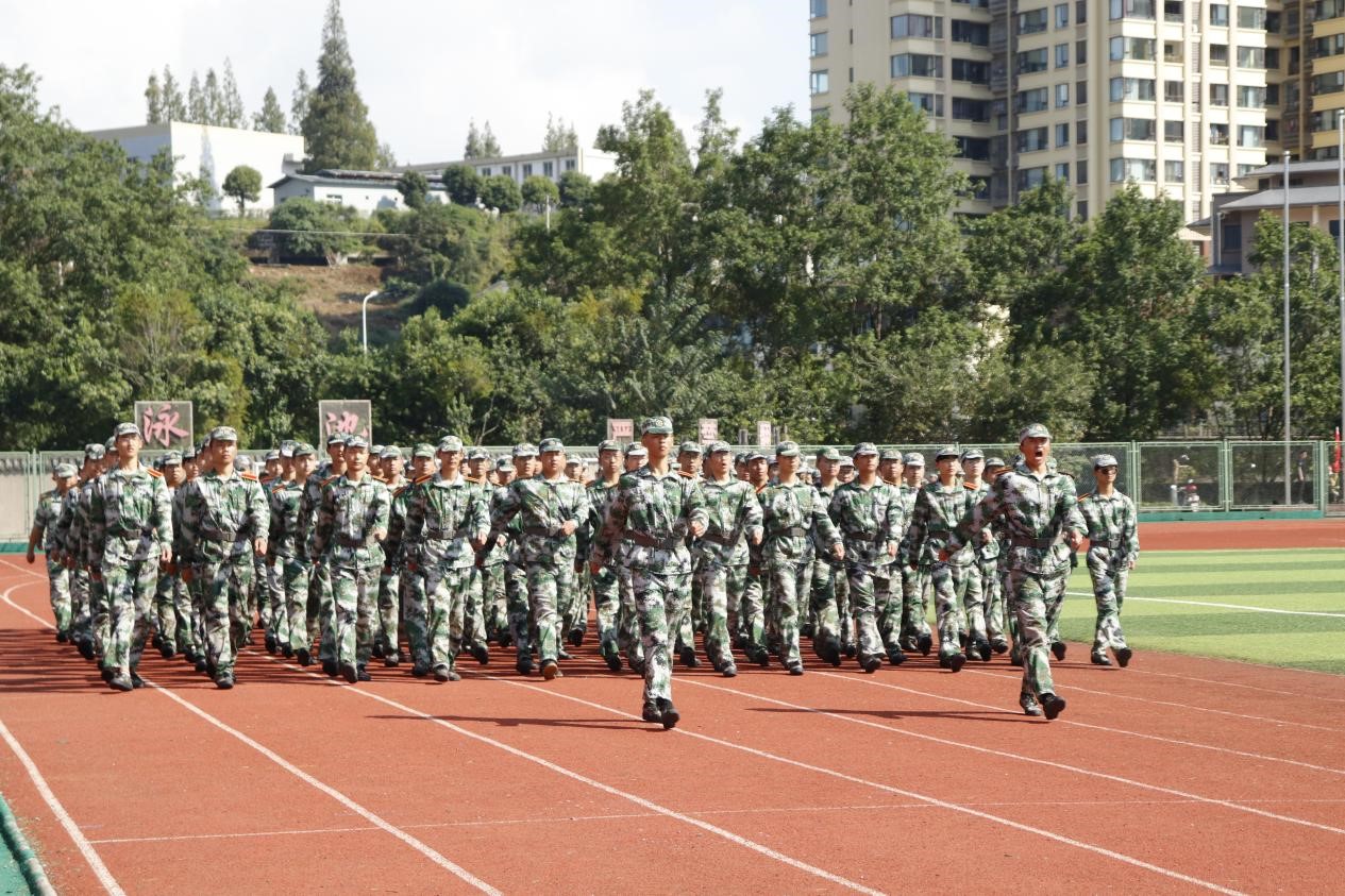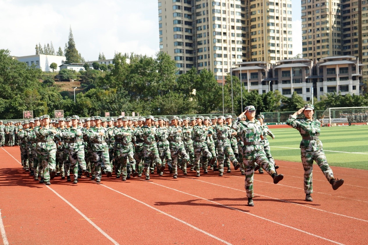 阳光刺破云层,照在学子的迷彩服上。学员们排成一个个整齐的方队,映出的影子也是整齐的,举手投足间如军人般令行禁止,他们正为即将到来的军训汇演积极准备着。