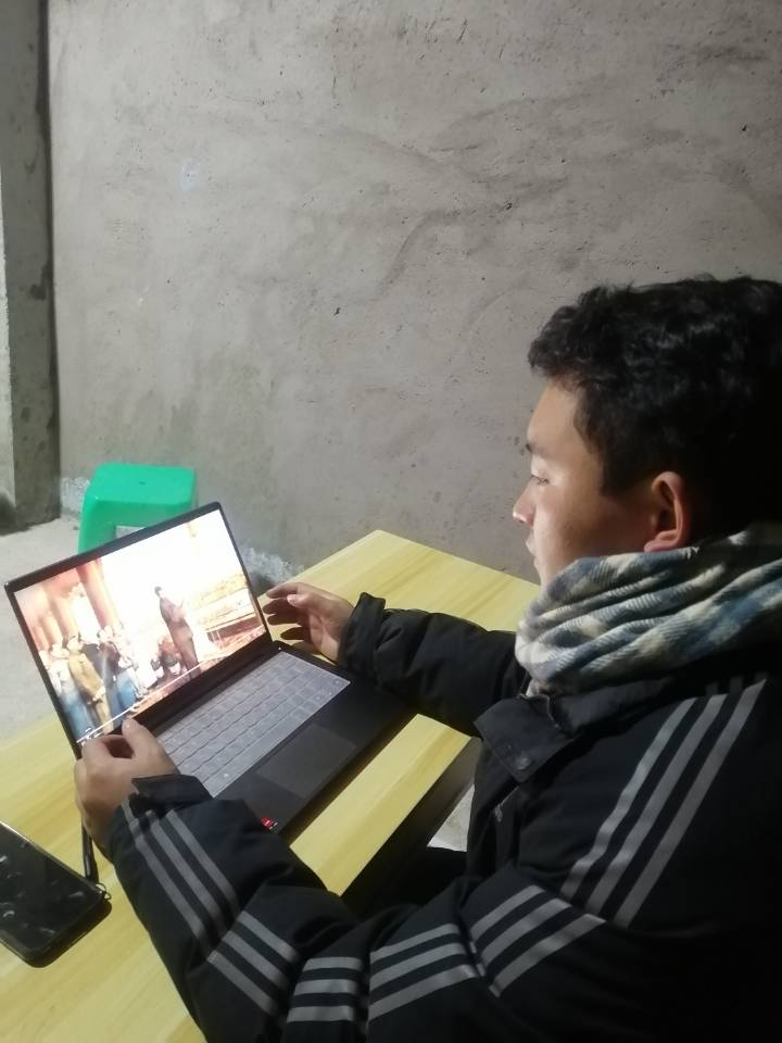 图为团队成员在家查阅党史资料+确么拉体摄