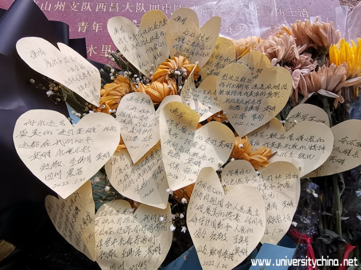 图为团队为烈士献的花和感谢寄语+赵兴茹摄
