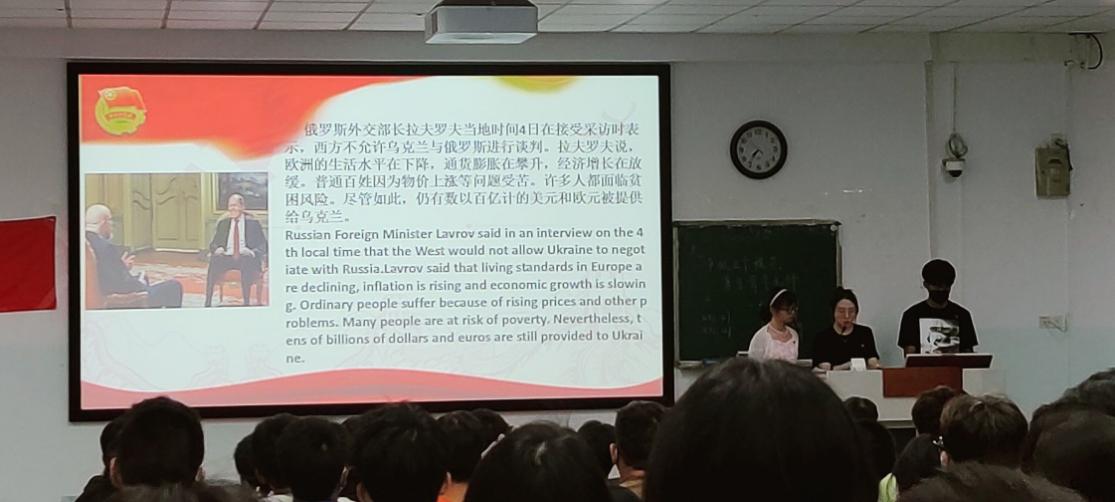 活动伊始,庄严激昂的团歌拉开了活动帷幕。通过观看青年大学习视频,团员青年学习了新思想,感受到了青年应有的担当与作为。接着,由来自英语、食工专业的同学进行了中、英文双语新闻播报,新闻播报了有关俄乌局势、北京新冠疫情以及6月5日的神舟十四号载人飞船成功发射的消息。其内容紧跟国际时事,关注国内变化。通过双语新闻播报,团员们对近来发生的大事有了更清晰的认识。