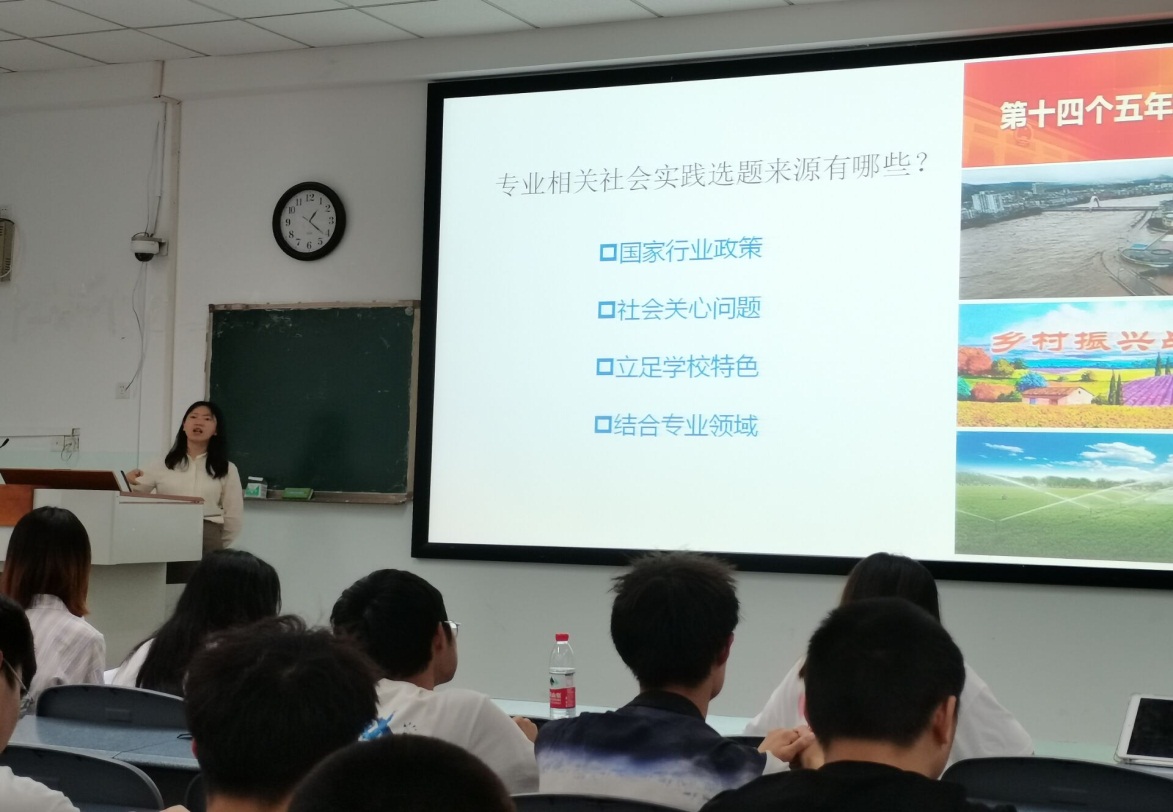 首先,学院实践部同学对暑期社会实践活动内容及注意事项进行详细讲解,此外还特别介绍了学院品牌项目“水足迹”,并着重强调了此次社会实践的参与率要求。